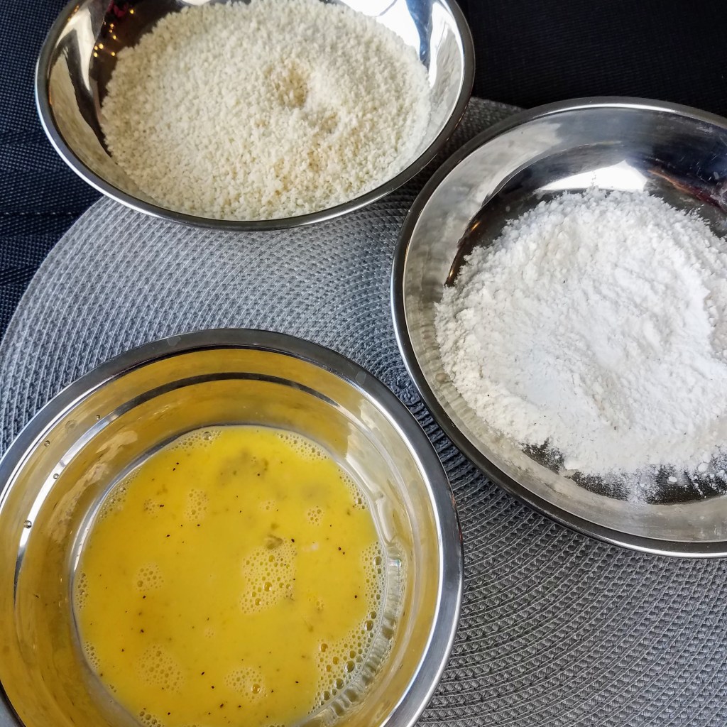 Next, set up a breading station. You will need three separate shallow containers or bakeware for these following steps. Place your egg mixture in one container, flour in another, and then panko in the other.