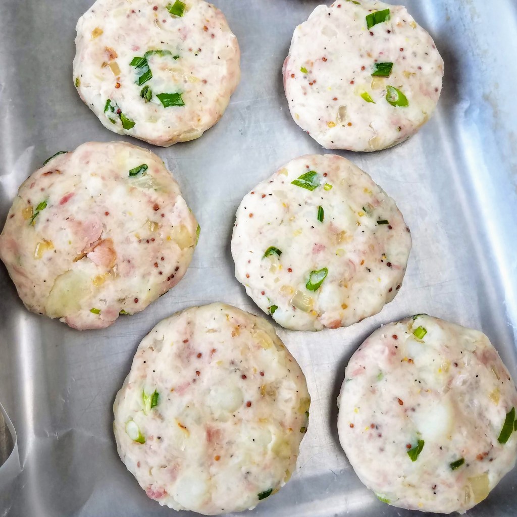 Add ham, cooked onions, and mashed potatoes to the mixture. Mix well, taste for seasoning, and then divide the mixture into 8 equal portions. Form into 1-inch thick patties as seen below. Transfer the patties to a parchment lined cookie sheet.