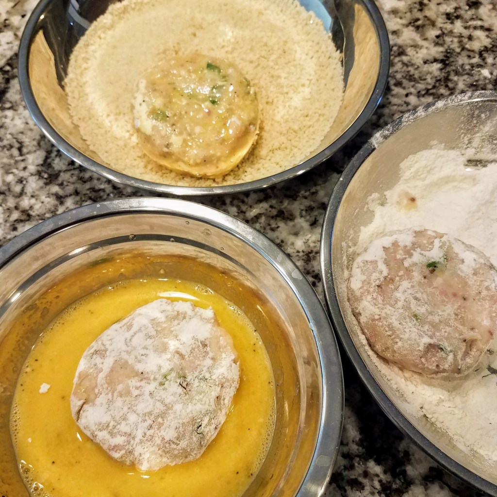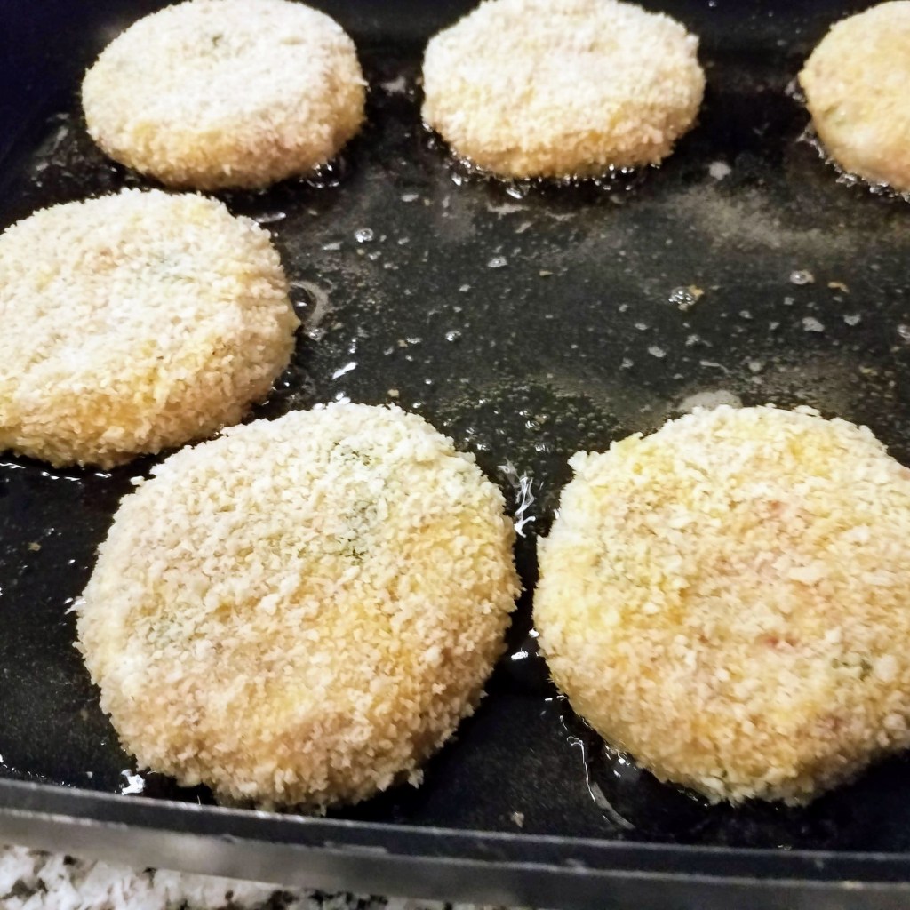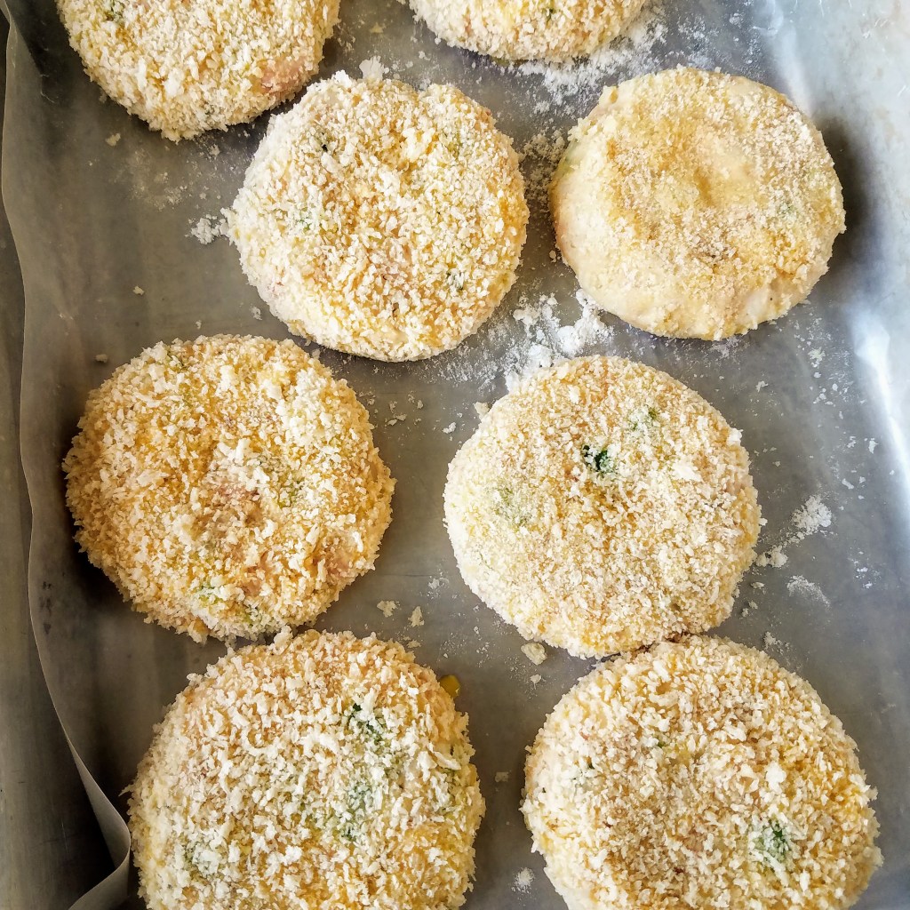 Carefully, taking one cake at the time, coat the patties in flour mixture. Then, shake of excess flour. Next, dip the floured patties in egg mixture and make sure to coat well gently. Finally, coat the egg dipped patties into panko bread crumbs. Transfer the patties to a parchment lined cookie sheet and refrigerate for 30 minutes.