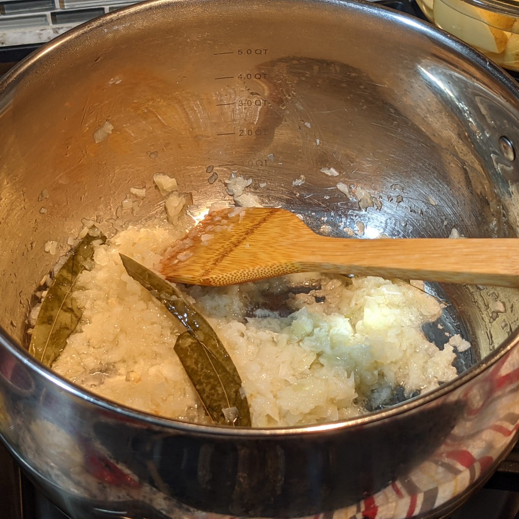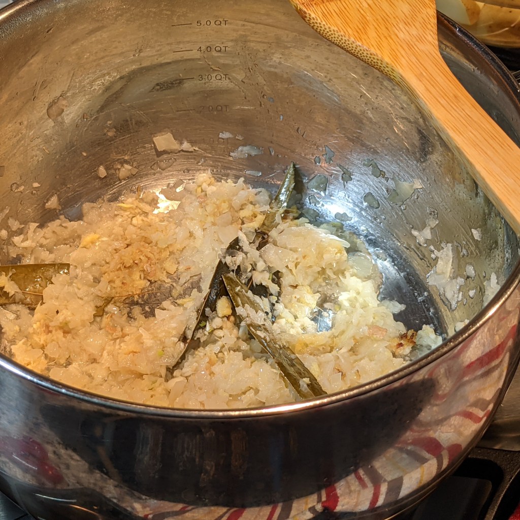 Heat a large heavy bottom sauce pan over medium heat. Add oil. When the oil is hot, add bay leaves. Cook for 30 seconds, then add chopped onions and cook for 4-5 minutes, stirring often. Add ginger, garlic, then cook, stirring for 3-4 minutes or until the onions are lightly golden brown. Make sure not to burn the onions. Turn down the heat to low.