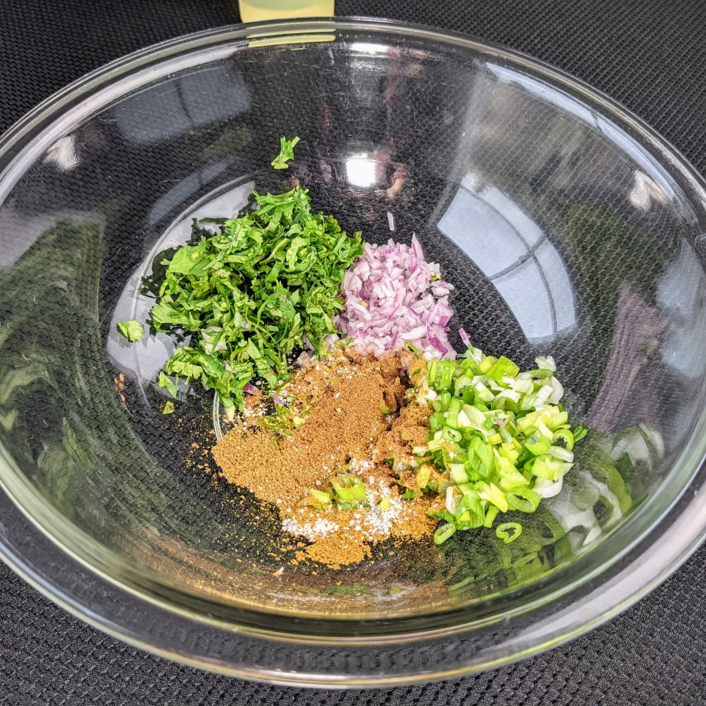 In a large bowl, mix chili, cilantro, green onion, and dried spices. Make sure all the ingredients are well combined. Add mashed potatoes and beaten egg to spice mixture. Mix well.