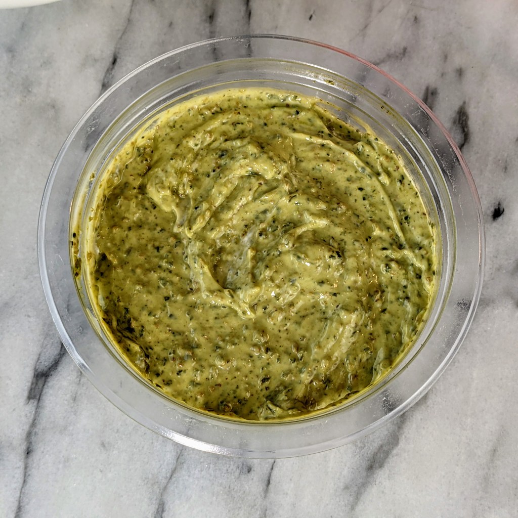 In a food processor, add all ingredients except oil. Process until all ingredients are minced. Scrape the sides of the processor if necessary. Turn on food processor and drizzle in oil. Process until the pesto reaches your desired consistency. Stop and scrape down the sides if necessary. Taste for seasoning. You can thin out the pesto with more oil if you’re using this pesto for pasta dishes.