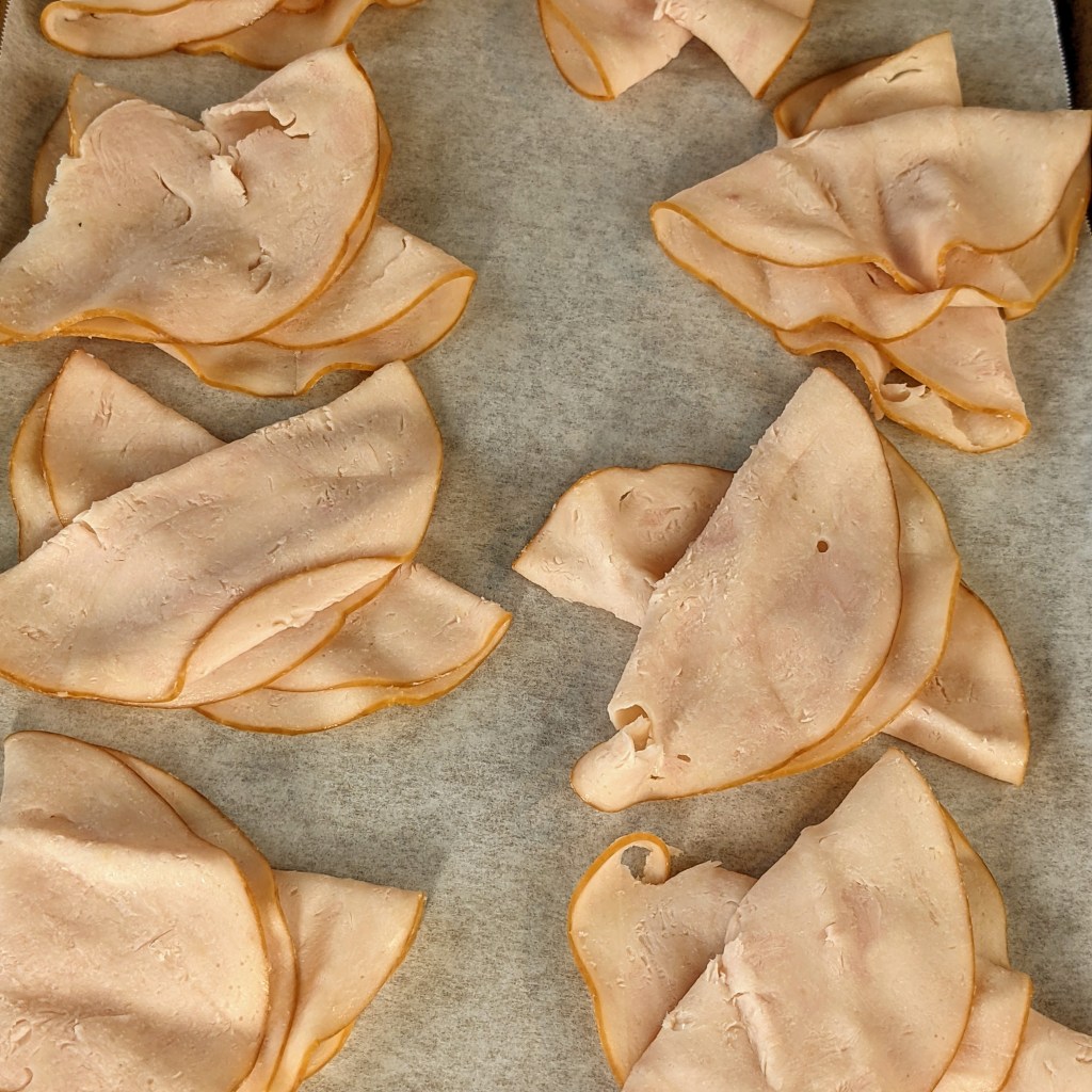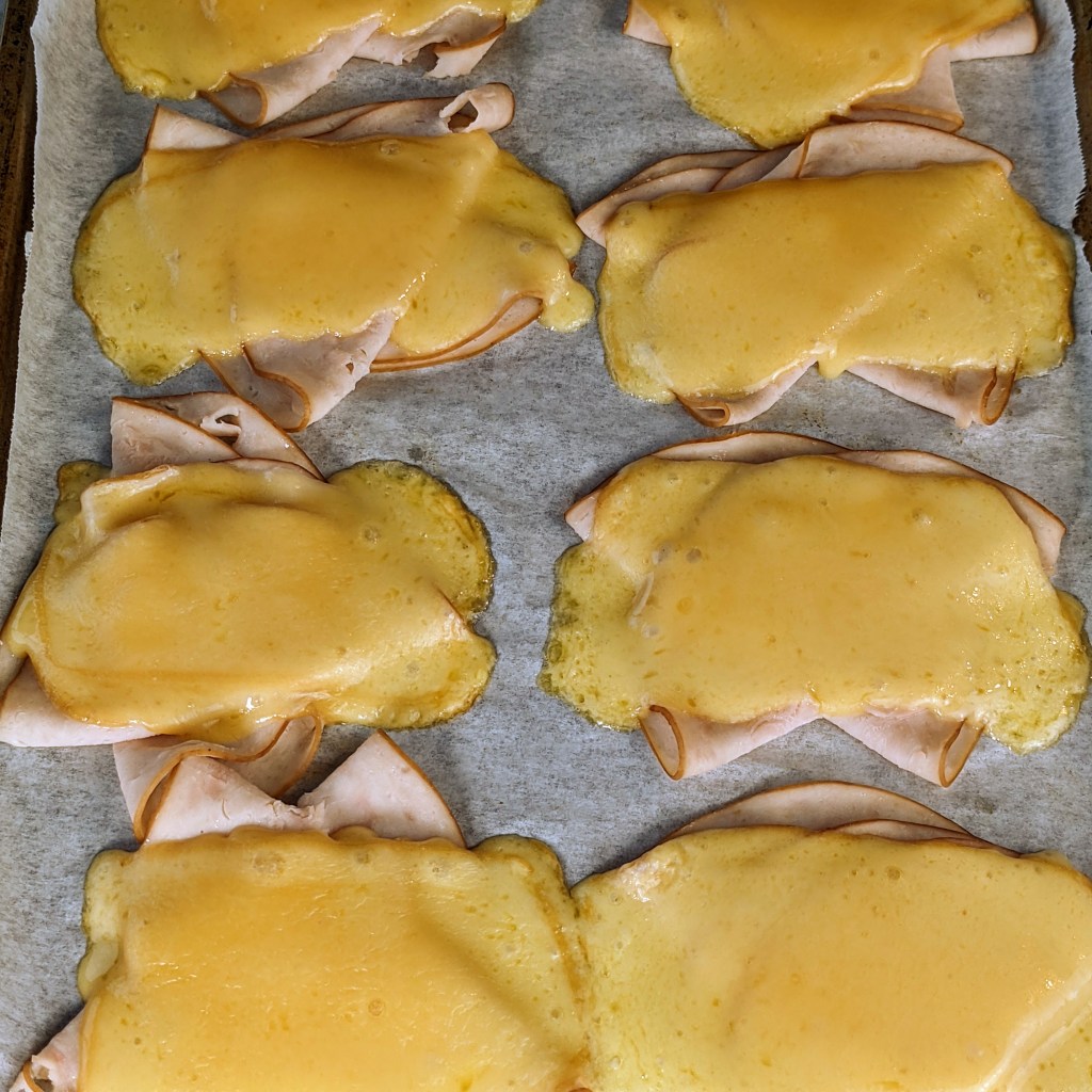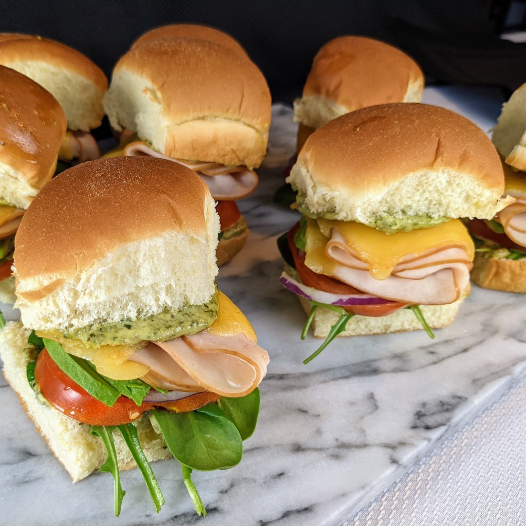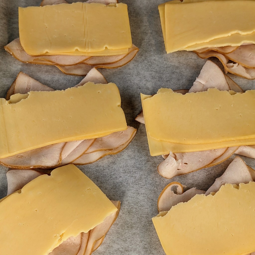 Mix mayo and pesto together in a bowl and set aside. Line a baking sheet with parchment paper. Make 8 stacks of turkey and cheese and place it in a parchment line baking sheet. See the picture below. Broil the turkey and cheese for 2-3 minutes, until the cheese melts.
