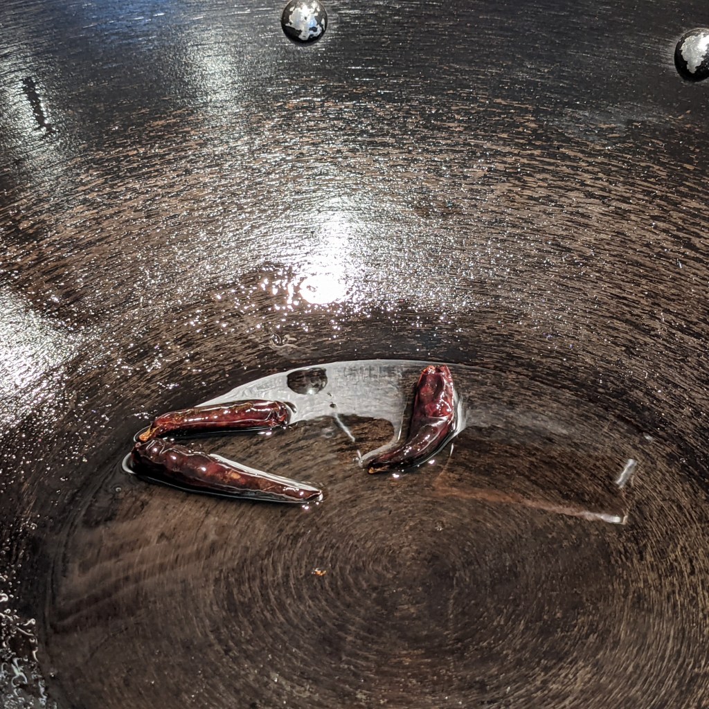 Heat 1 tbsp. oil in a small pan or skillet on medium high heat. Stir fry the chilies in hot oil till it changes color. After a few minutes, the chilies will turn dark brown. Turn off the heat, remove the chili, and place in a bowl.