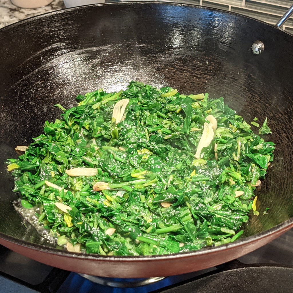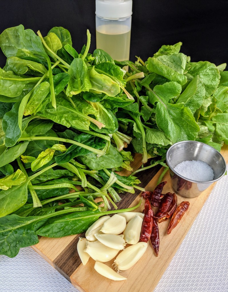 For the mixed greens, I used one pound of spinach and two bunches of radish leaves. When I buy radishes from the store, I make sure to get ones with the leaves attached. You can pair the leaves with spinach which works well in my opinion.