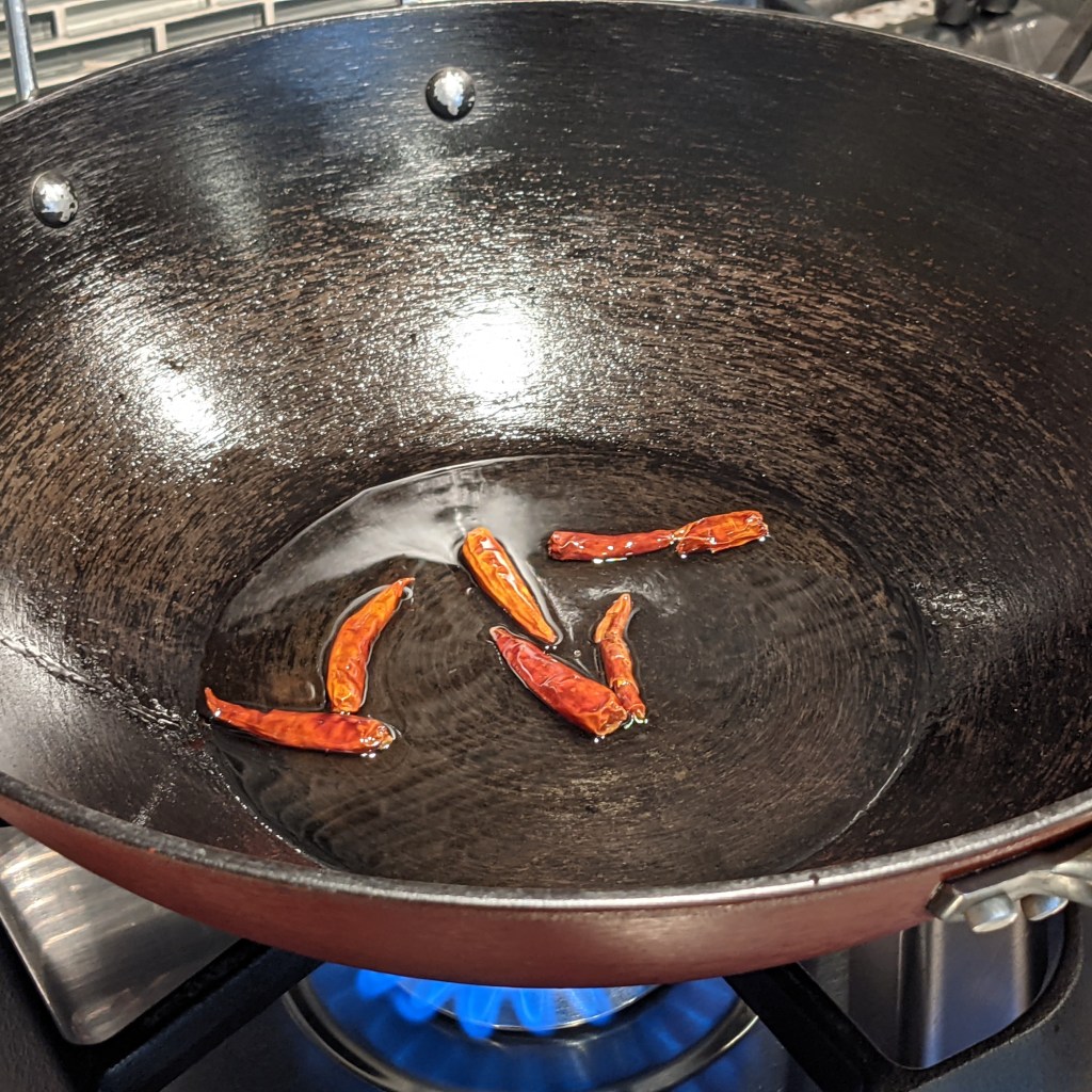 Heat oil in a medium sized deep frying pan. When oil is hot, add dried chili peppers. Take chili peppers out when they change the color and smoke a bit. It should turn dark brown. Set aside.