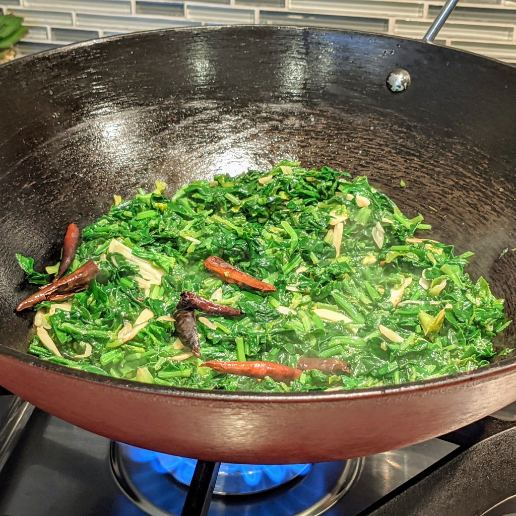 Dried chili adds a distinct flavor to the spinach dish. Usually people break up the dried chili with our hand and eat it along rice and others dishes are being served.