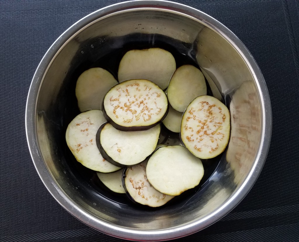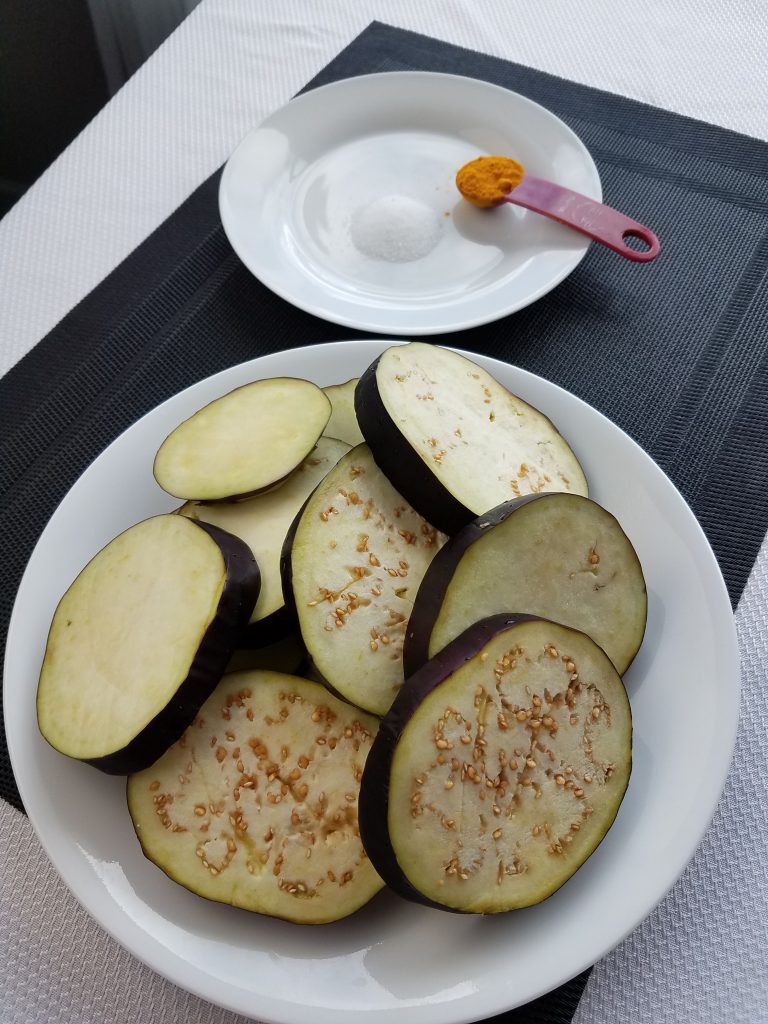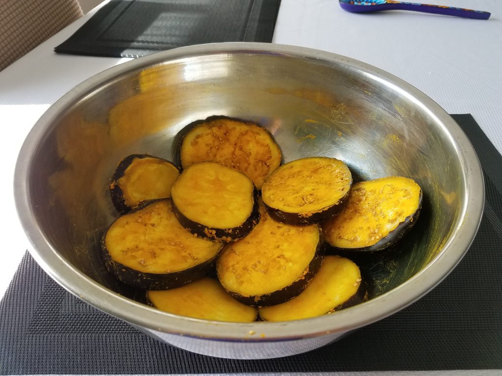 Transfer the eggplant into a large bowl. Mix with 1 tsp of salt and turmeric. Rub the slices well to incorporate the turmeric and salt into each piece. Set aside for 10 minutes.