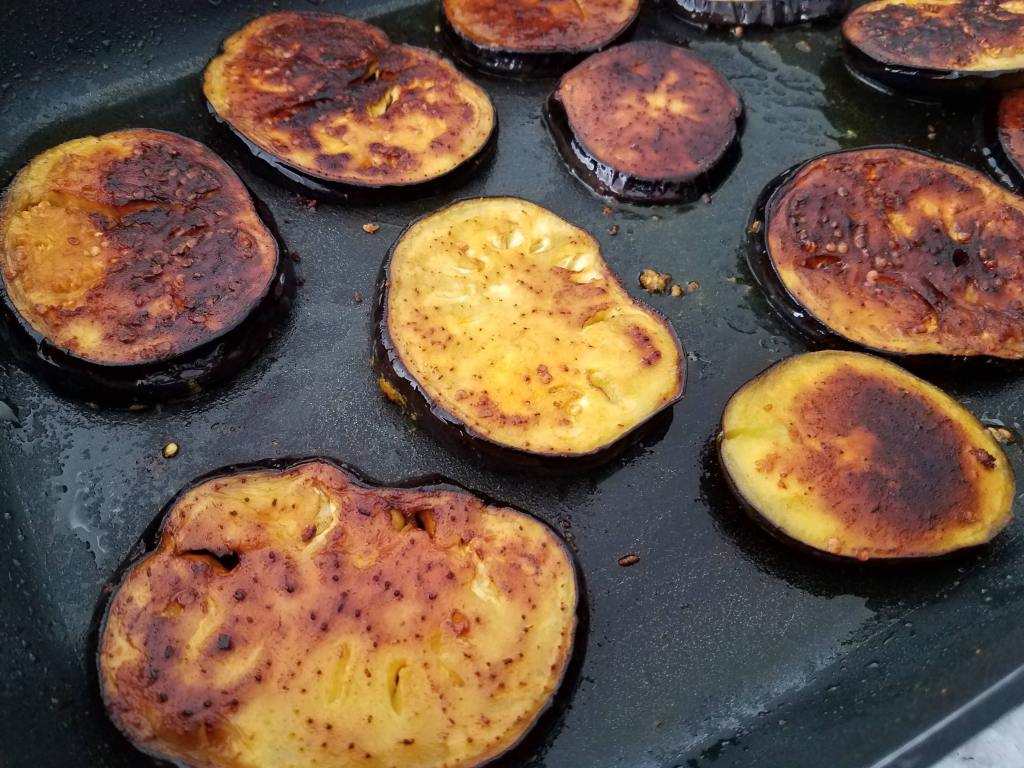 Heat oil in a large non-stick skillet at medium heat. Once the oil is hot, put the slices of eggplant into the pan as you can, making sure not to stack them. Fry the eggplant till both sides are golden brown and soft for 5-7 minutes.