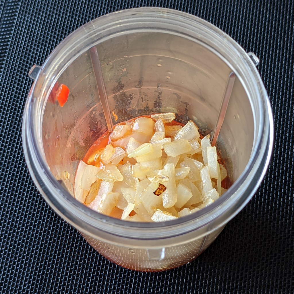 Transfer the onions and pimentos to a small food processor cup. Process until pureed.