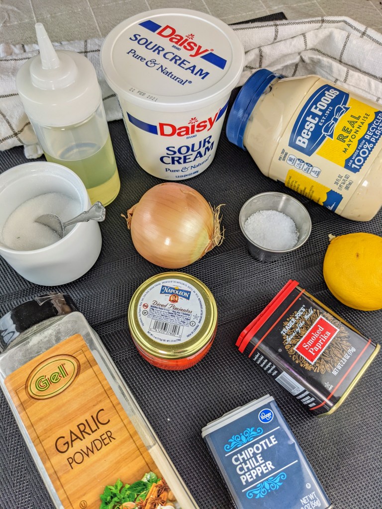 Chipotle peppers are red jalapeños that have been smoked and dried. You could get these from a can, but I greatly prefer the flavor that comes from using dried chipotle pepper powder. By combining this with other ingredients like smoked paprika and pimentos, you get a sophisticated twist on a Tex-Mex type of flavor.