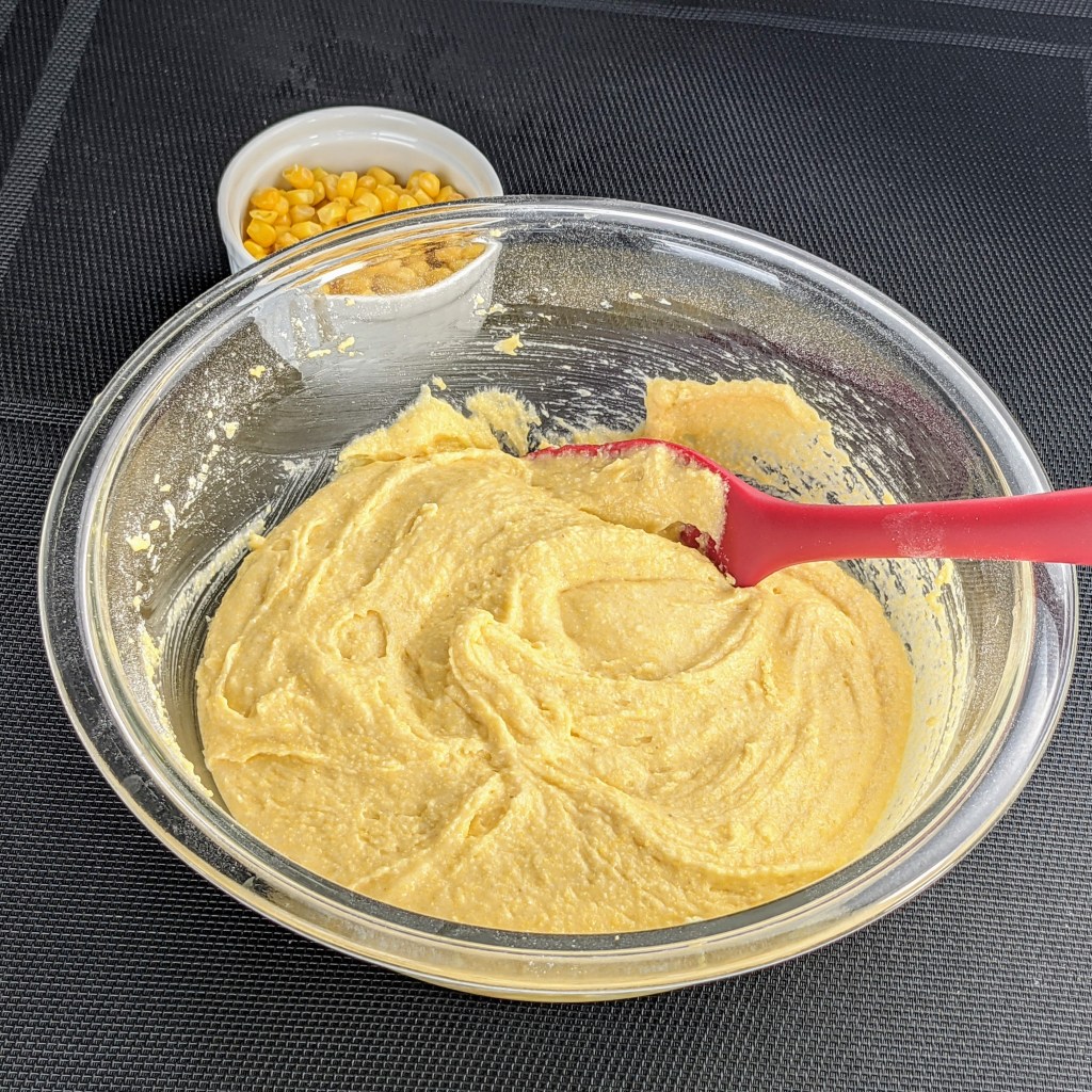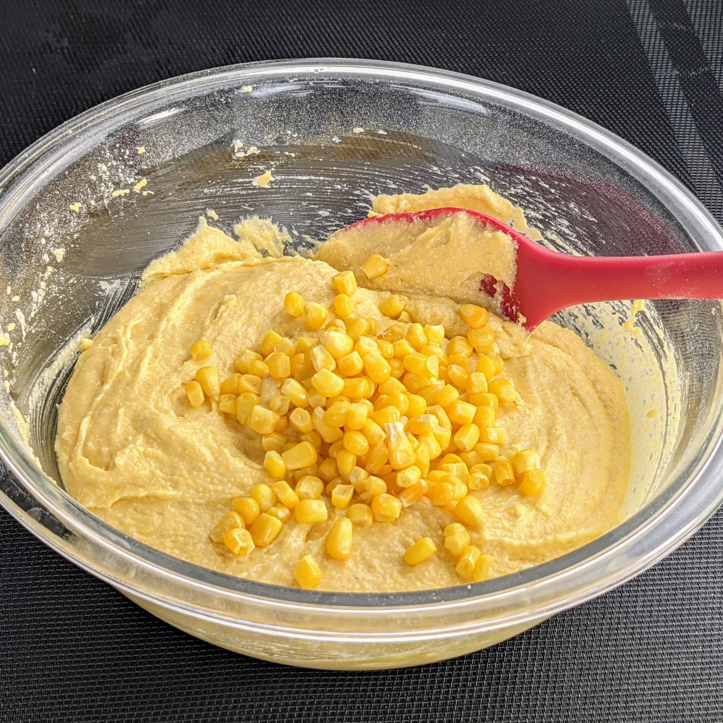 Next, add corn meal, flour, baking powder, and salt to the cream mixture. Mix all ingredients together until nice and smooth. Fold in the thawed corn.