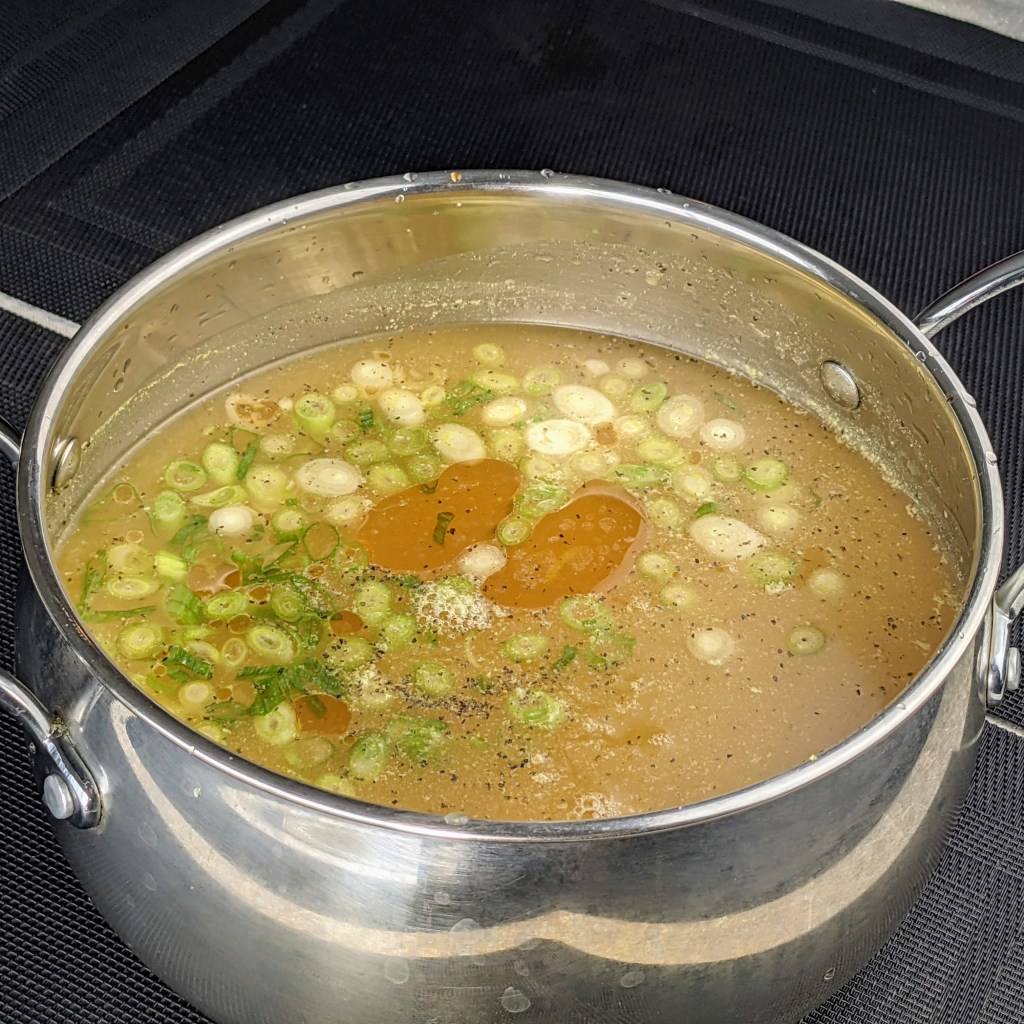 Mix water and the broth base in a soup pot with a whisk. Add 1 tbsp. soy sauce, sesame oil, salt, and pepper. Taste the broth, then add another 1 tbsp. of soy sauce if needed. Make sure everything is thoroughly combined.