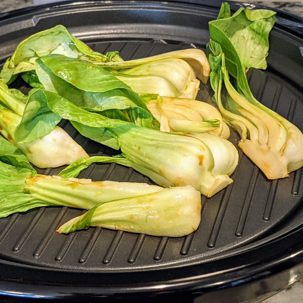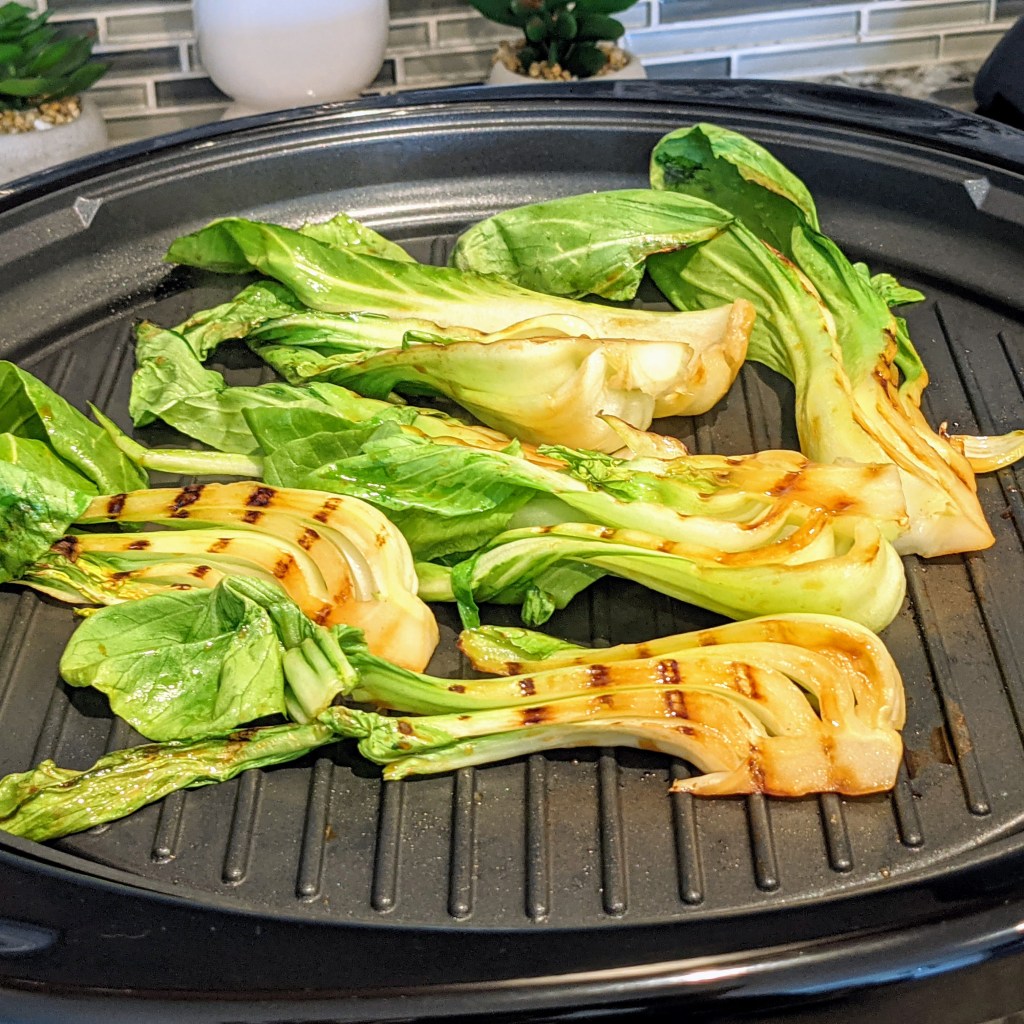 White the potstickers are cooking, place all bok choy ingredients in a bowl. Gently toss the mixture to combine. Heat an indoor grill and grill the bok choy, flipping once or twice for 2-3 minutes over medium-high heat to get some char.