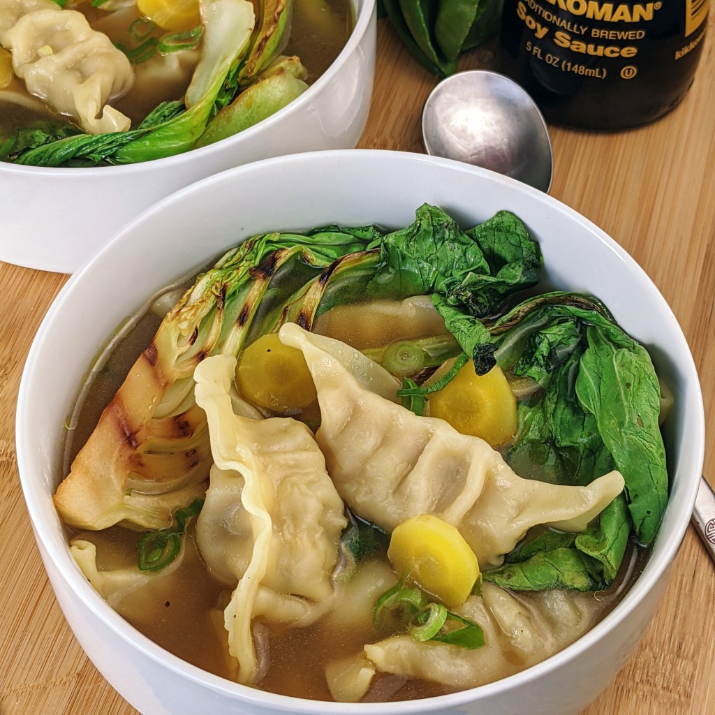 Once the potstickers are cooked, taste for seasoning. To serve the soup, divide the broth into 6 soup bowls. Then, add 3-4 potstickers and add 1 piece of bok choy in each bowl. Sprinkle over the reserved green onion on each bowl and enjoy.