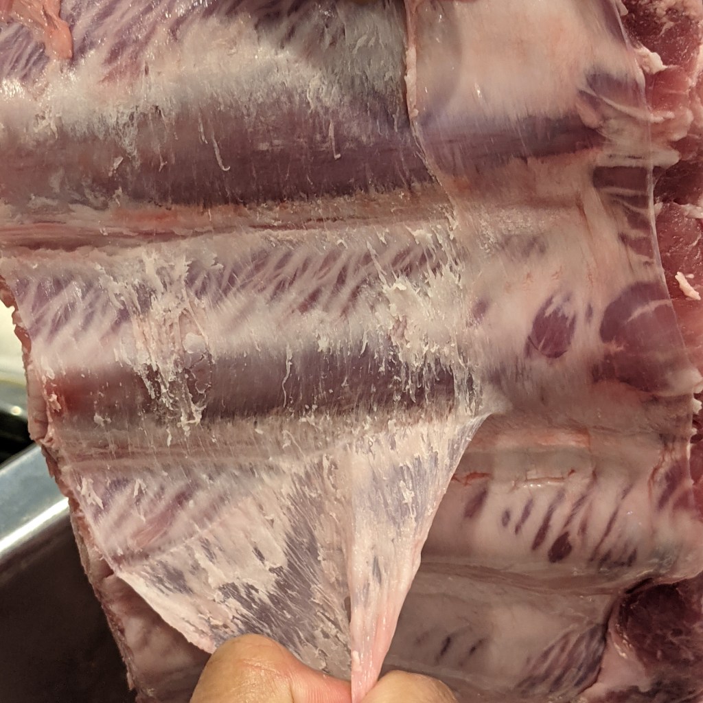 Cut the ribs in two pieces if it doesn’t fit in your baking dish. You can also leave it whole. Dry the ribs thoroughly and remove the silver skin from the back of the ribs, shown in the bottom left picture. Sprinkle the BBQ rub on both sides of the ribs thoroughly. Leave the ribs to marinate for an hour.