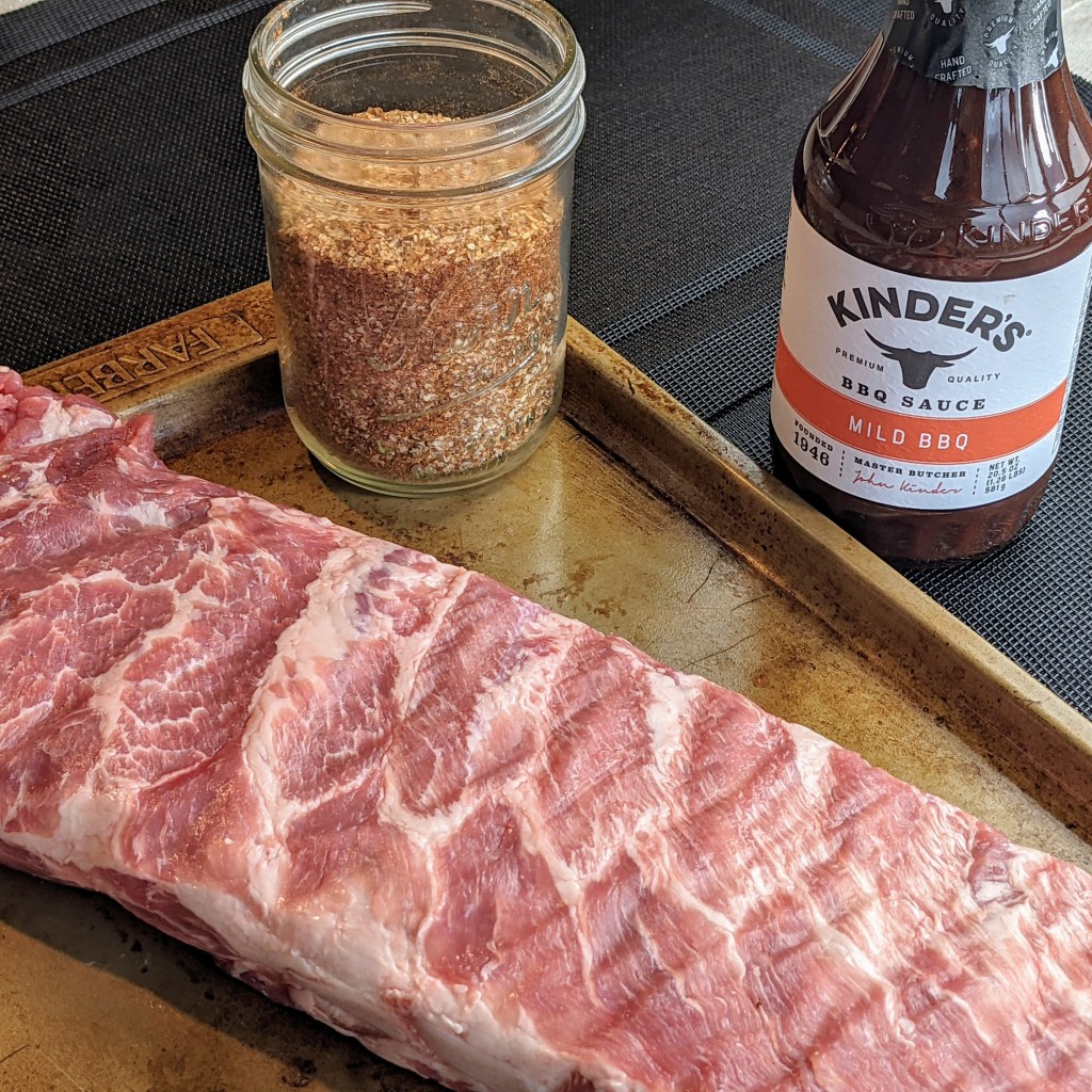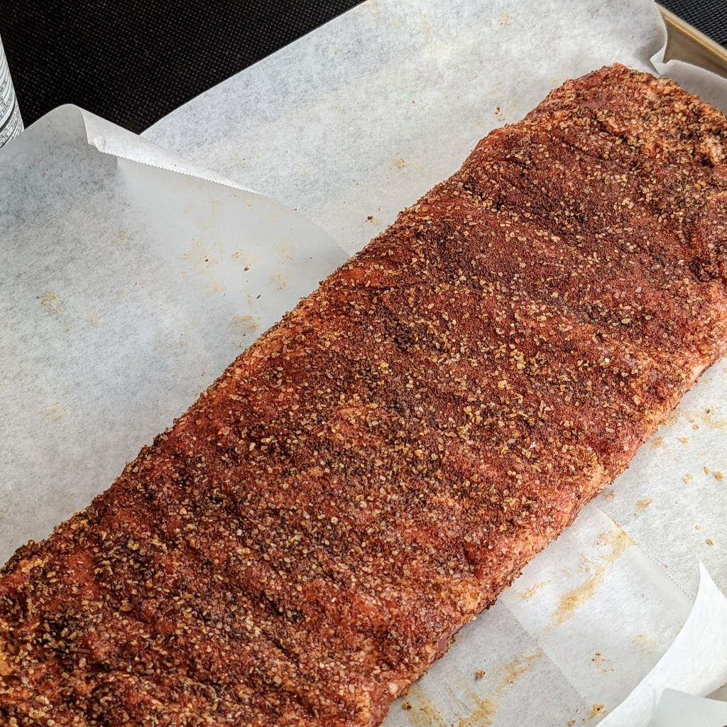 To make the ribs I start out with a flavorful rub made of various spices and sugar. I found a great rub recipe from a cook book I bought few years ago called “Slow Fire: The Beginner’s Guide to Barbecue by Ray Lampe.” This rub is unique in that it has spices like cumin and turmeric. I use this in recipe below.