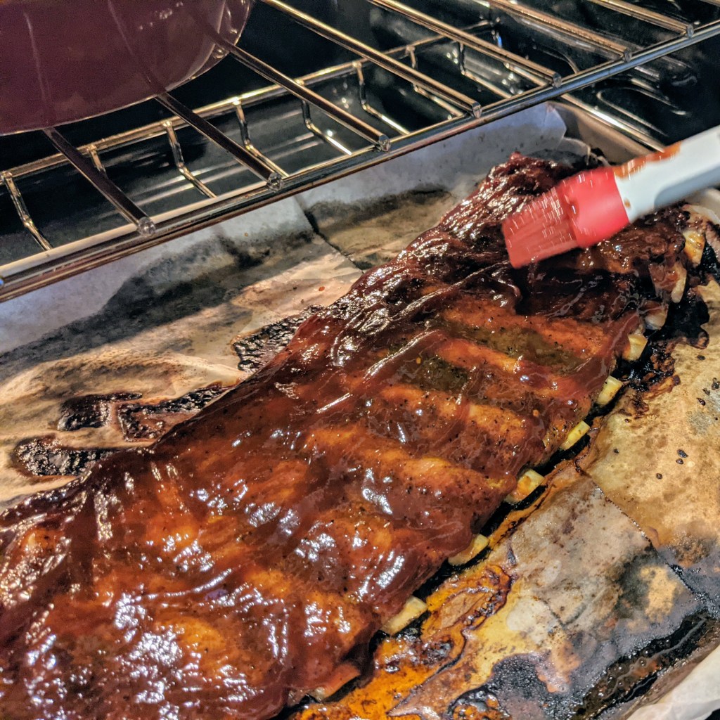 Place the meat on a greased foiled lined baking pan and cover with foil. Cook the meat for about 1 1/2 hours. After hour an a half, remove the foil cover (be careful when removing the foil because of the hot steam) and brush the ribs with BBQ sauce.
