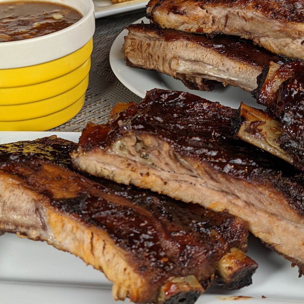 One of the dishes I like to serve for a party is barbecued ribs. Pork ribs are one of my favorites. I like to use the cut called St. Louis style ribs. These are cut from the belly of the hog and much meatier than other ribs. They are flatter than baby back ribs, which makes them easier to brown. These also have just the right amount of fat to make them very flavorful and juicy.