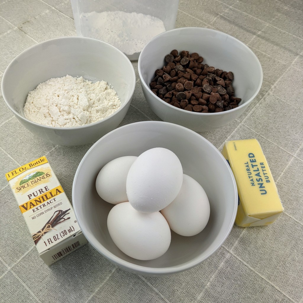 The original recipe is great but — as always — I have found over time that it’s even better if you make some changes. First, I like to use two kinds of chocolate chips — semi sweet and milk chocolate — instead of bitter-sweet chocolate bars. Partly this is because I always have chocolate chips on hand, but I also like chocolate chips because they are the perfect size for these cakes. Second, I like to use four jumbo eggs as opposed to 3 whole eggs and then 3 egg yolks (requiring 6 eggs altogether). Finally, I also like to add extra vanilla for its richness and flavor.