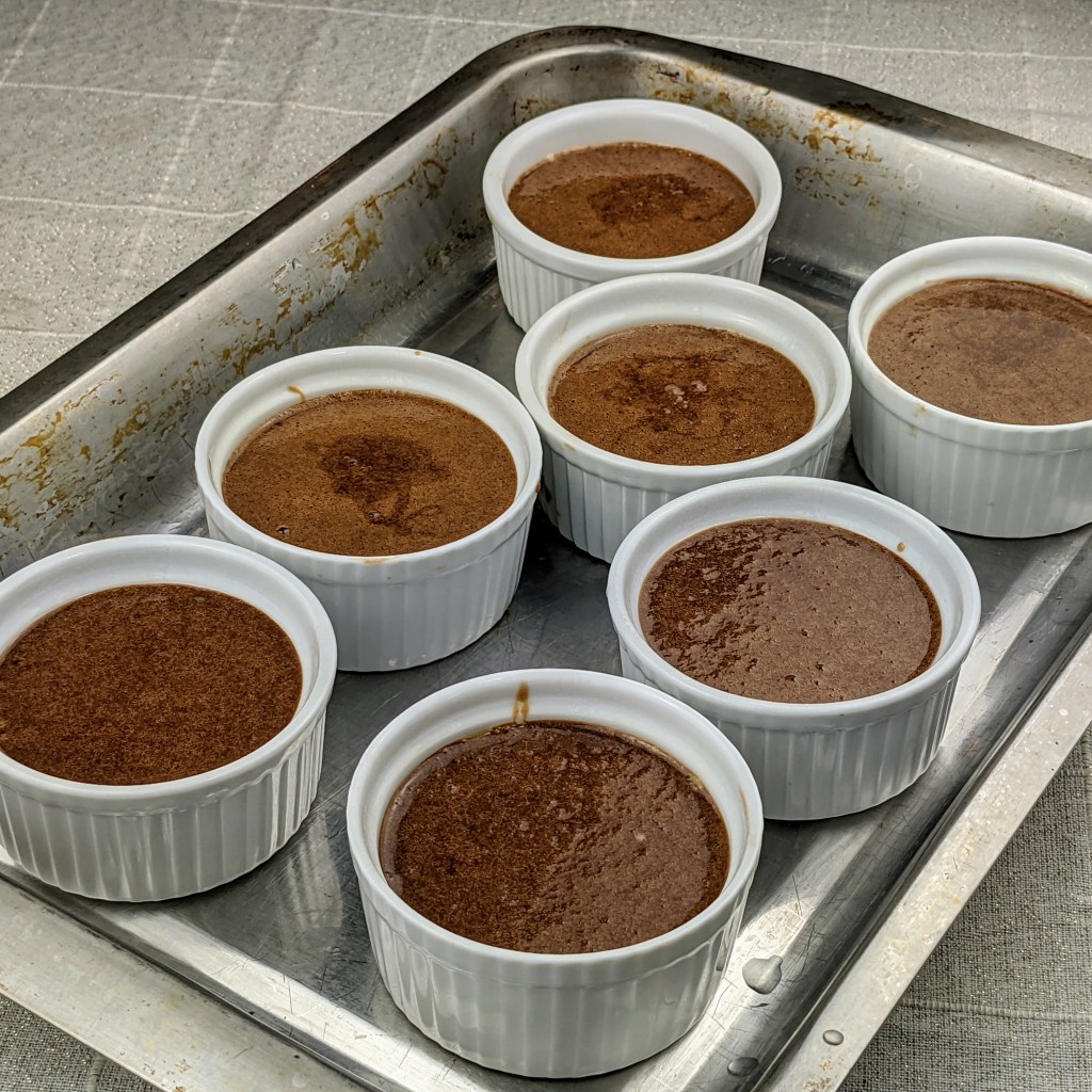 Whisk eggs in a large bowl until blended, using a hand held blender. Whisk in powdered sugar, then chocolate mixture, and mix well. Fold in flour, then divide the batter into the seven prepared dishes.