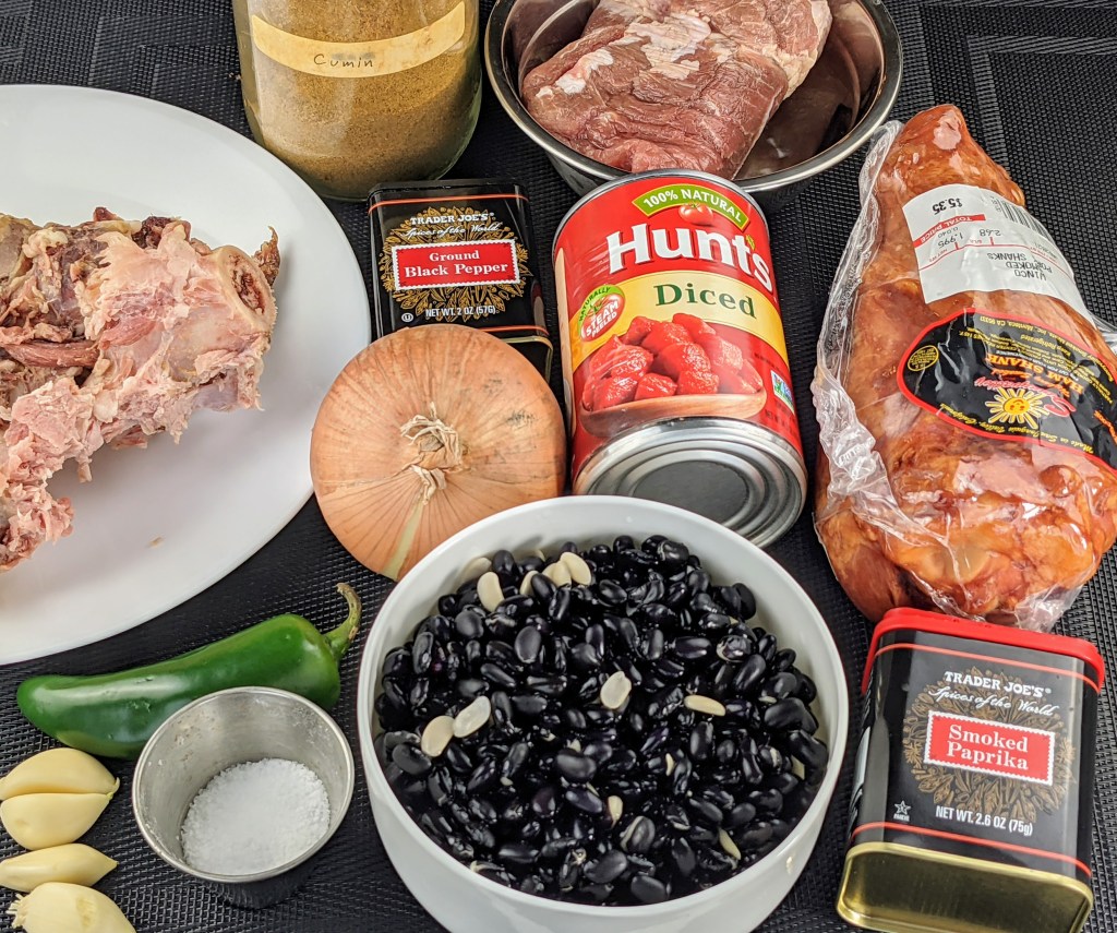 For this recipe you can kind of get away with whatever you have on hand. Below I make my hearty pork and bean stew with pork butt, smoked ham shank, ham bone, onions, garlic, jalapeno, and other spices. If you are missing some of these, you could try bacon, beef, or any type of ribs. One trick I do is grill the whole onion, jalapeno, and pork pieces before I add them to the stew. Grilling them provides a very unique smoky flavor.