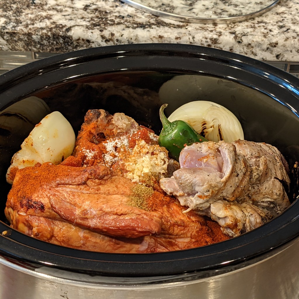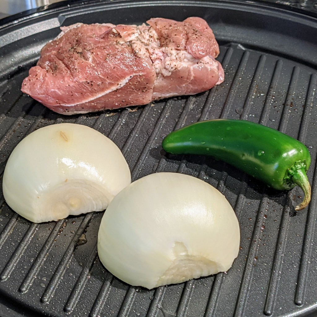 Place fresh pork in a bowl. Add 1/4 each salt and pepper. Mix well. Heat an indoor grill over medium-high heat. Spray the grill grates with non-stick cooking spray or brush with oil. Grill the pork, onion, and jalapeno, until the pork has grill marks in all sides and onions and jalapeno has char on all side. See the third picture for reference.