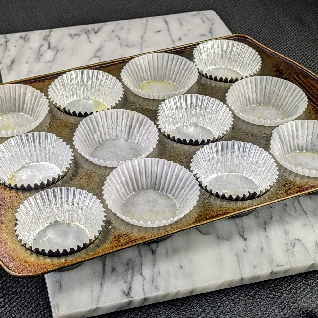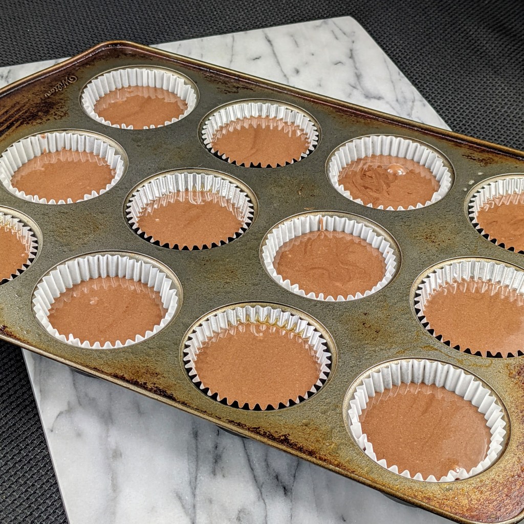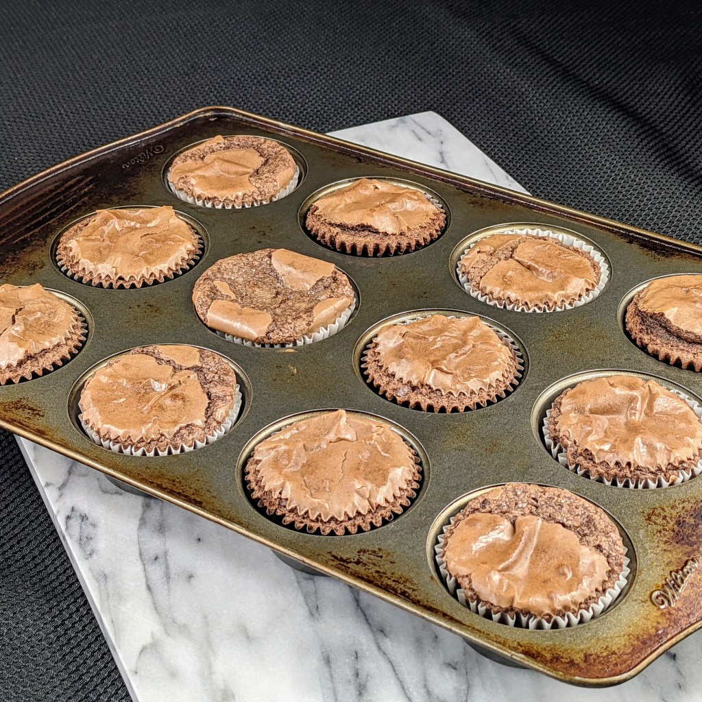 Bake in oven for 20-25 minutes or until wooden toothpick inserted in center comes out clean. Remove muffins from pan to wire rack. Cool completely. Once cooled, slowly remove foil line from the brownie.