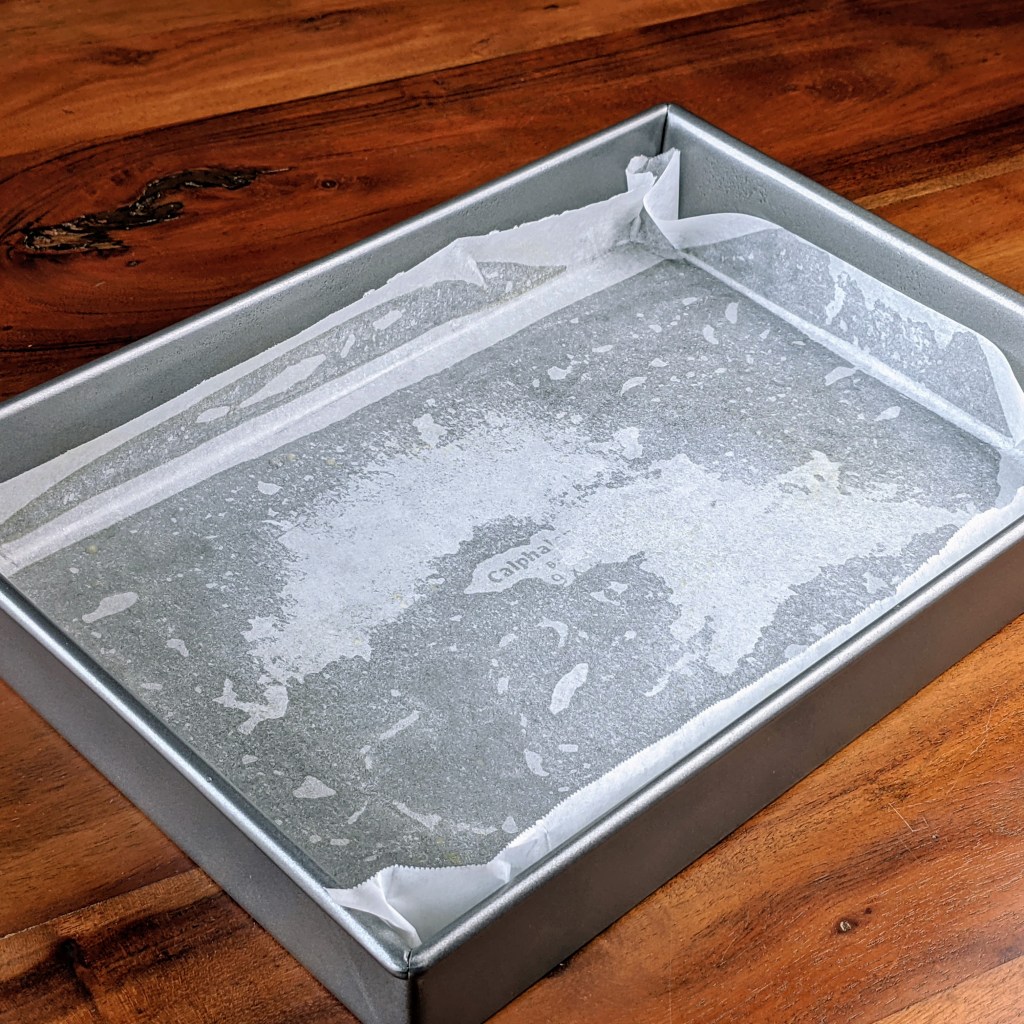 Preheat oven to 325 degrees. Line a 13 by 9 inch non-stick baking pan with parchment paper. Spray lightly with butter cooking spray and set aside for later.