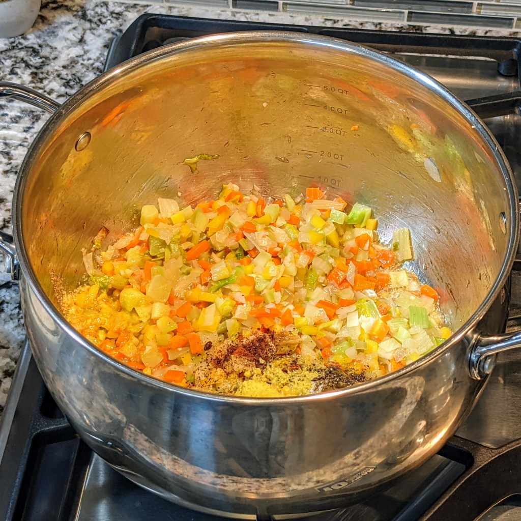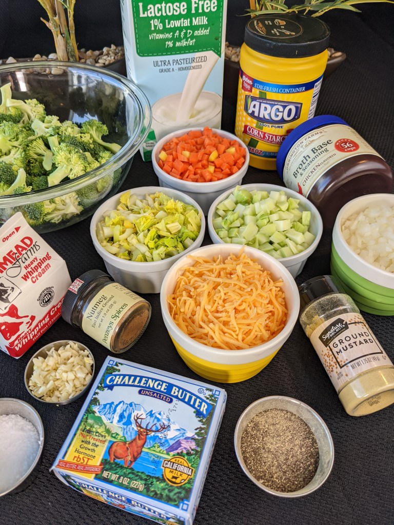 Heat a large soup pot over medium heat. Add butter and oil. When the butter is melted add onion, carrots, celery, broccoli stem, and garlic. Cook for 8-10 minutes, stirring often until the vegetables are cooked. Add mustard, nutmeg, salt, and pepper, cook for about 30 seconds. Stir in the chicken (or roasted garlic base) and cook for another 30 seconds.