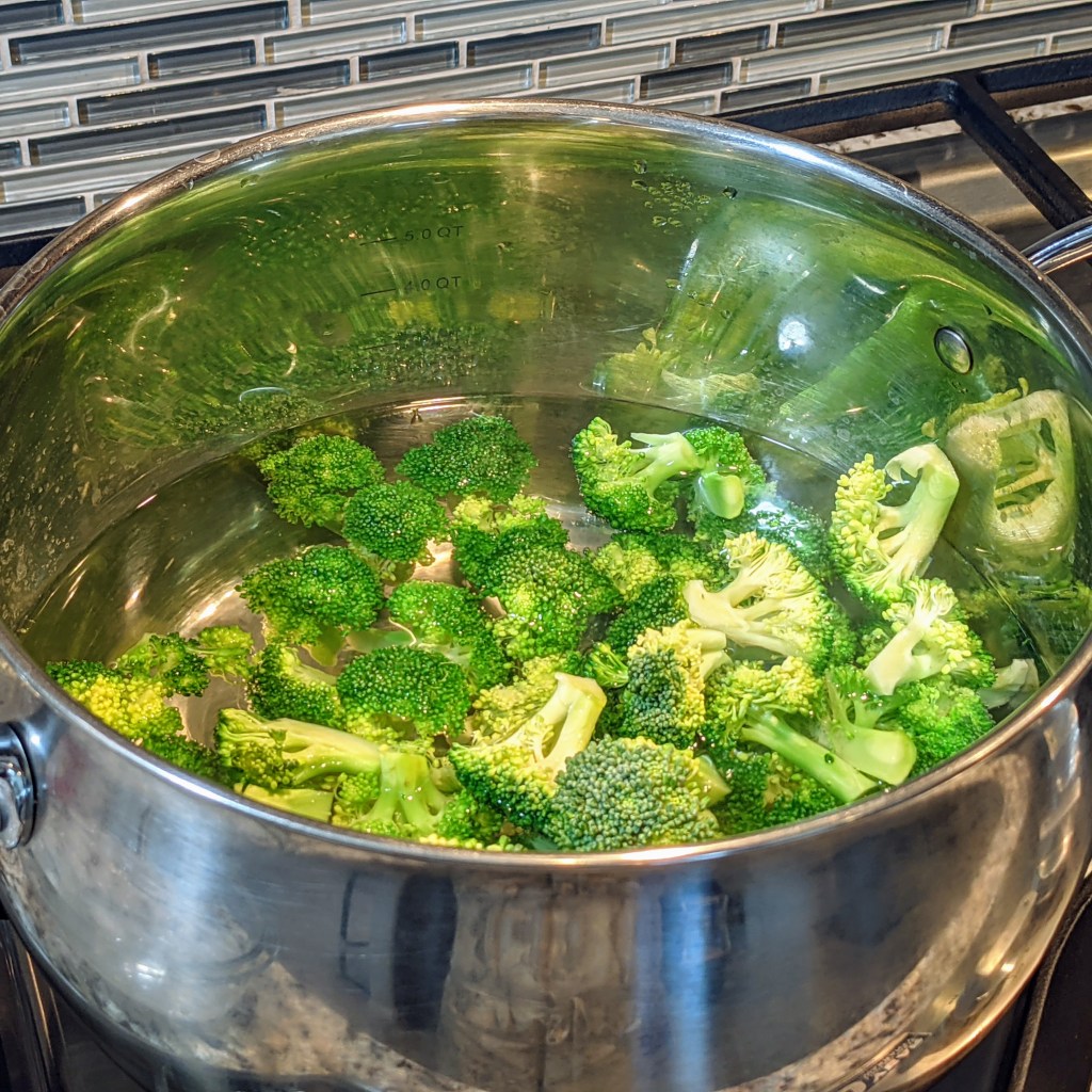 Carefully put the broccoli florets into the boiling water and cook for 3 minutes. The broccoli should be just barely tender and bright green. Remove the broccoli with a slotted spoon and immediately plunge into the ice water. When the broccoli is cool, drain it and set aside. Save 1 cup in a separate bowl for garnish.