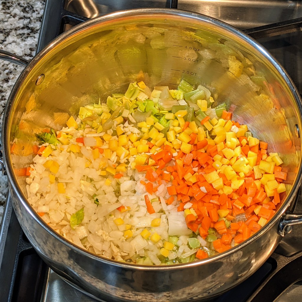 Whatever the reason, I set off to make my own version of broccoli cheddar cheese soup. The first thing I do below is add more broccoli as well as onions, carrots, and celery. I use chunky broccoli for extra texture and color. I also used real cheddar cheese from Oregon’s Tillamook Dairy. This is very fresh high quality cheese and really adds zest and richness to the soup.