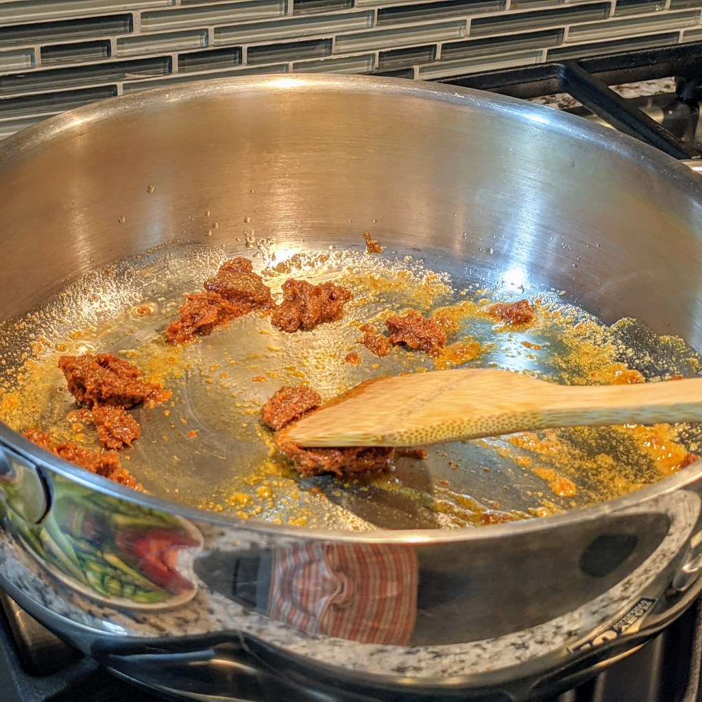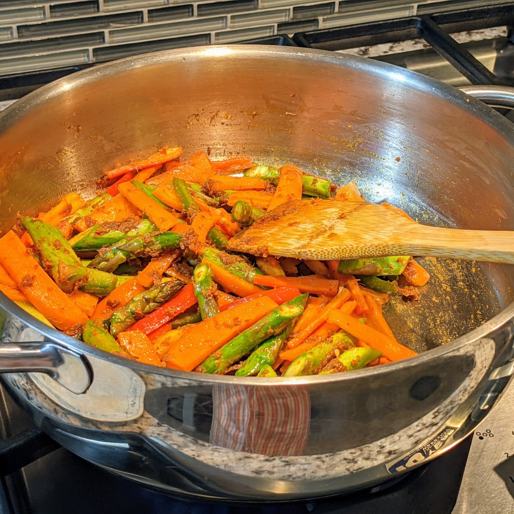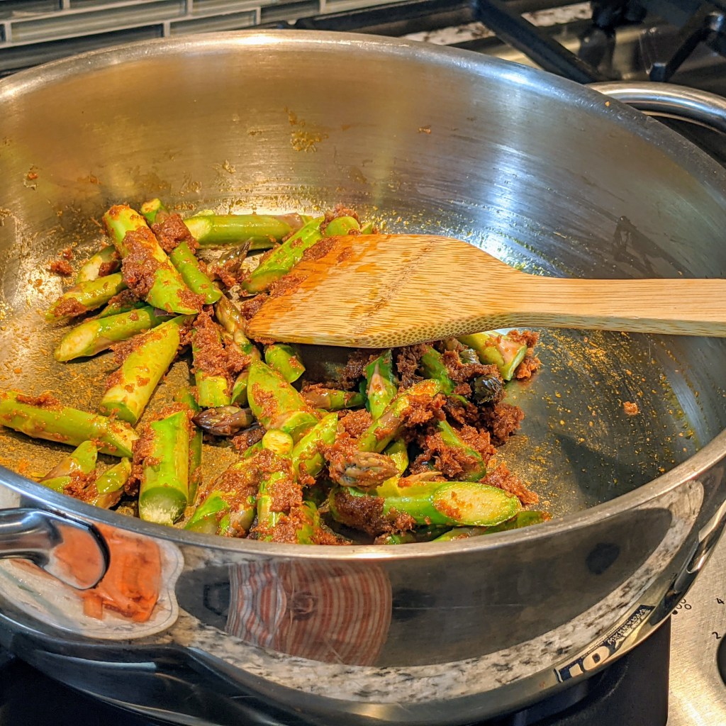 Heat oil over medium heat in large skillet or pan. Add curry paste, cumin, and coriander, then cook for a minute, stirring constantly so the mixture doesn’t burn. Add asparagus and stir well, then cook for a minute.