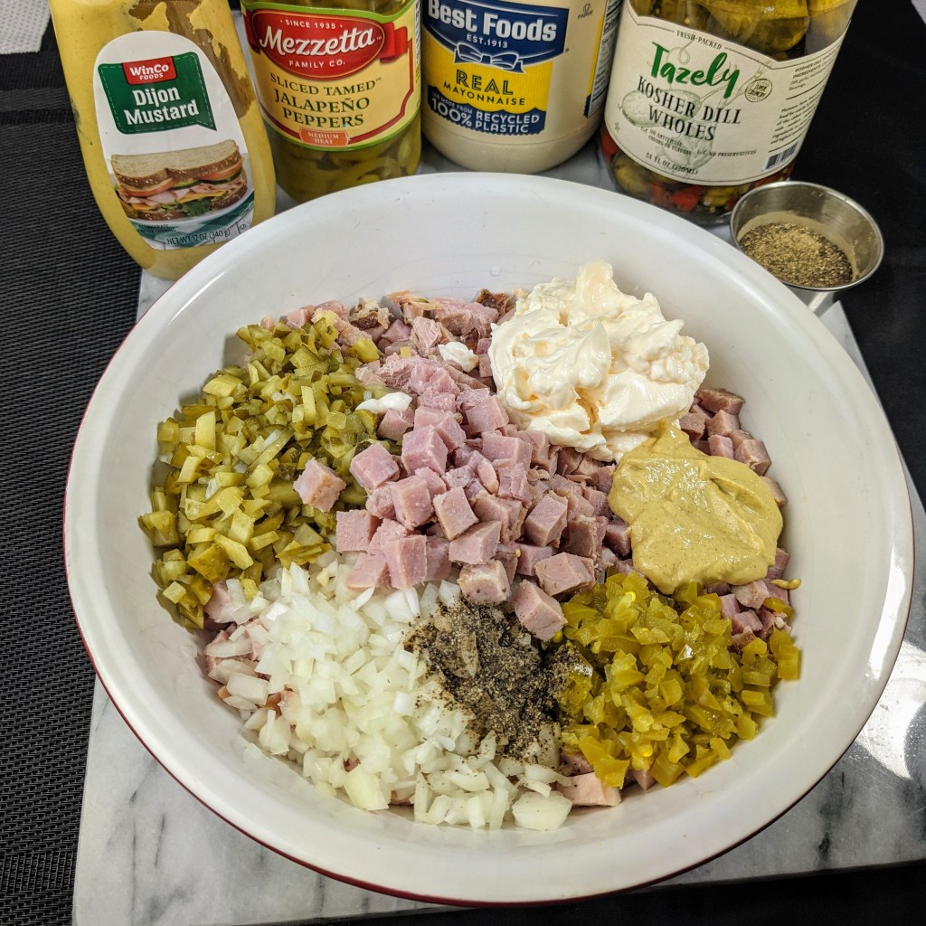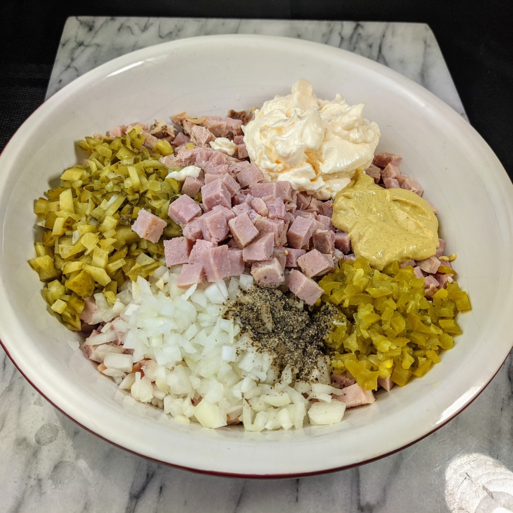 My recipe for ham salad is unique in that I don’t grind up the ham in a food processor as in most recipes. I prefer to dice up the ham with a knife so that it has more texture (small cubes) and greater eye appeal. A side benefit is less cleanup because you don’t have to wash a food processor when you’re done.