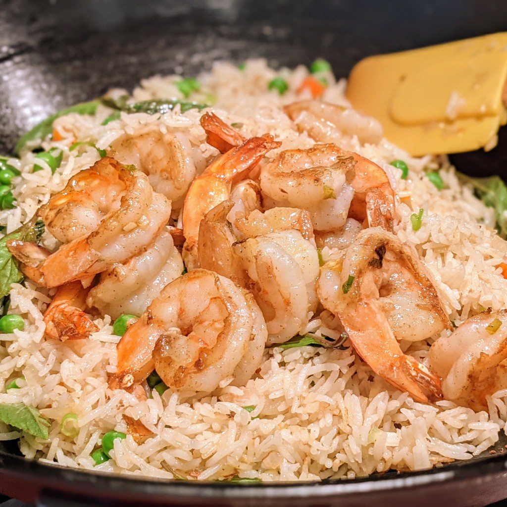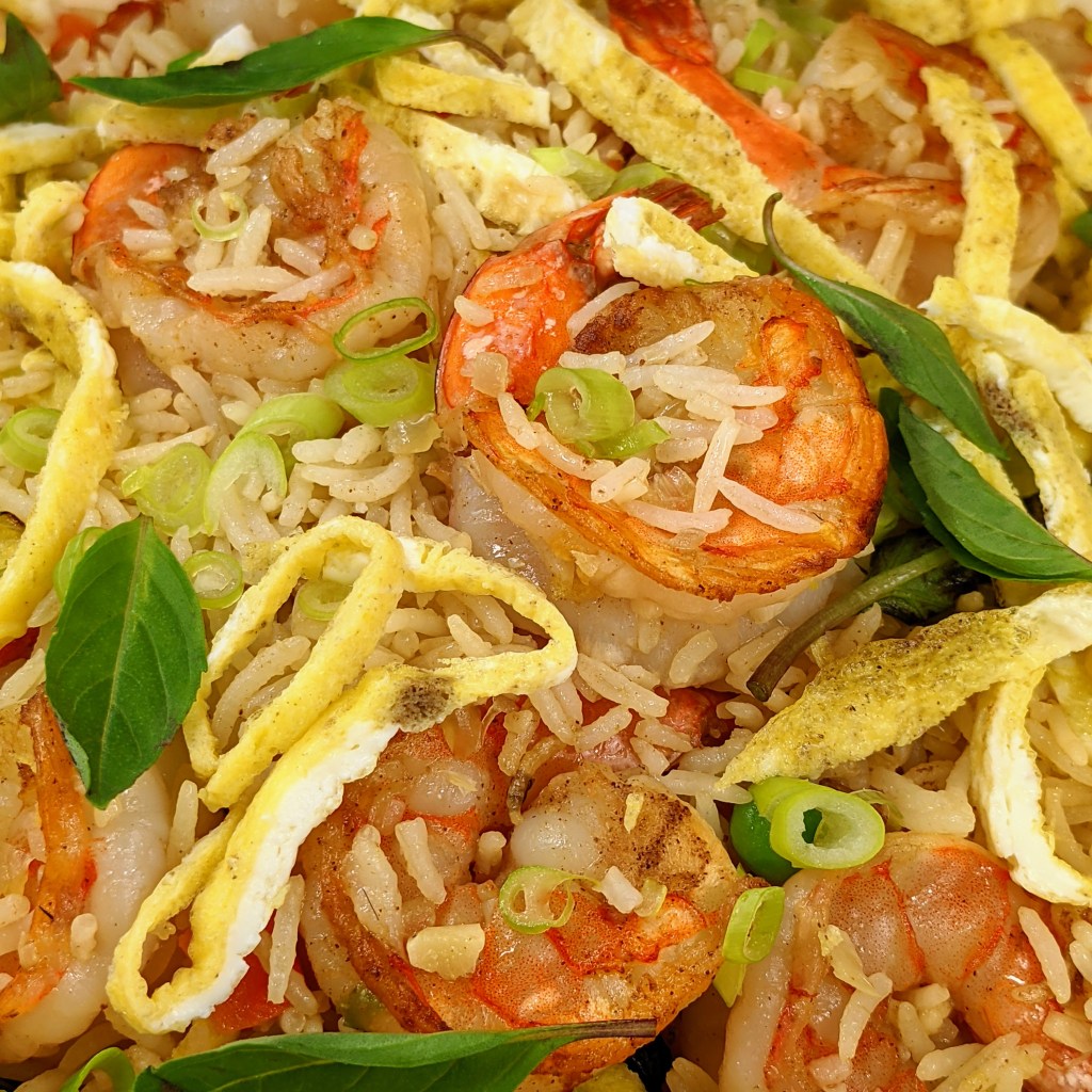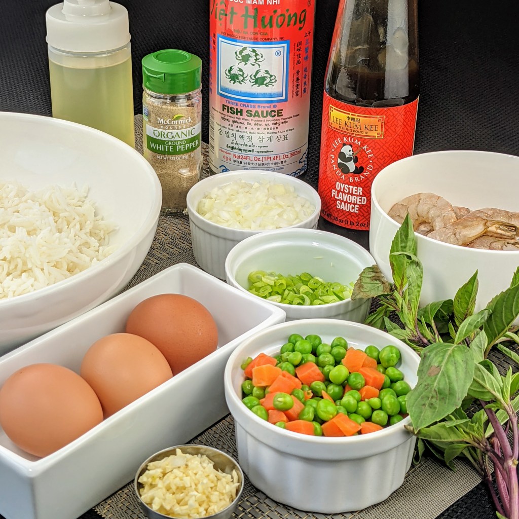 Today I am making Thai basil fried rice with shrimp. I’ve enjoyed this dish at Thai restaurants and came to like it a lot. I figured out how to make it on my own – at least my own personal version – and what’s great is that it doesn’t take long to make. Plus your whole family will like it.