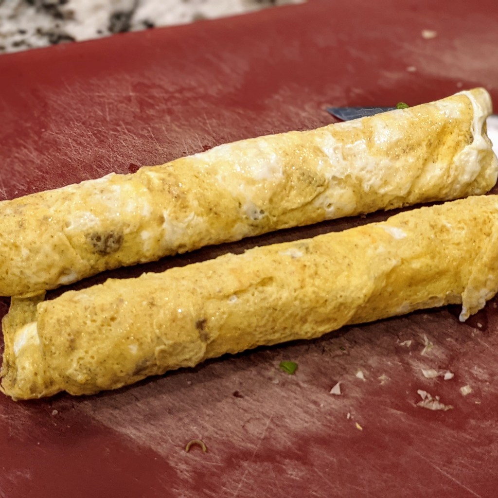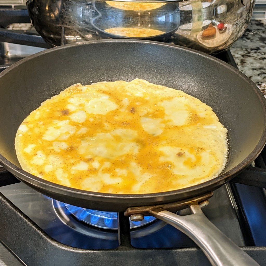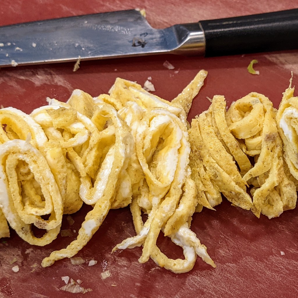 Working in two batches, using 1/2 tbsp. of oil at a time, cook the eggs like a thin pancake. Once the egg is cooked, remove it from the pan, cool until touchable, roll the egg pancake into logs, thinly slice, and set aside. See pictures for process.