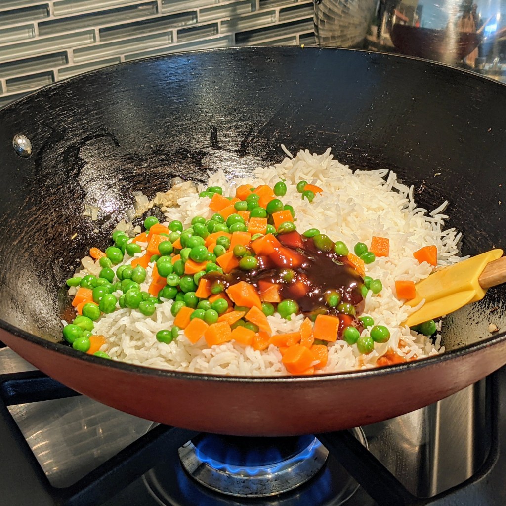 Add the remaining oil to the wok, then add the onion and garlic. Fry these for 2-3 minutes. Add the rice, peas, carrots, oyster sauce, fish sauce, and salt in next. Toss and stir together, then cook until everything heated through.