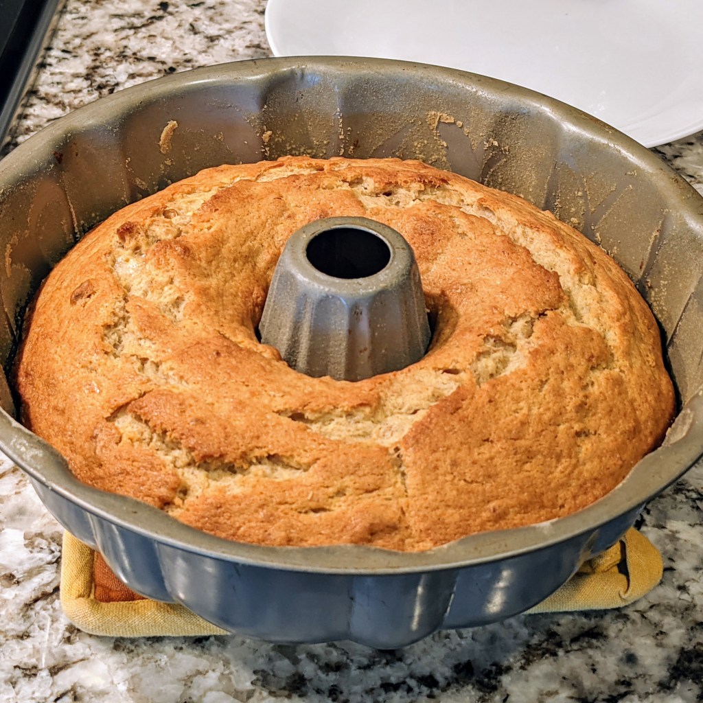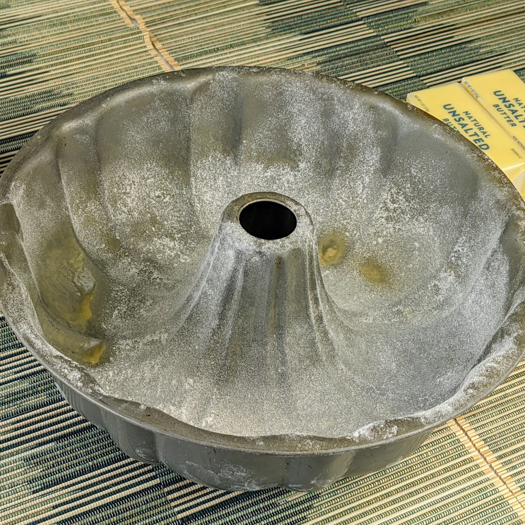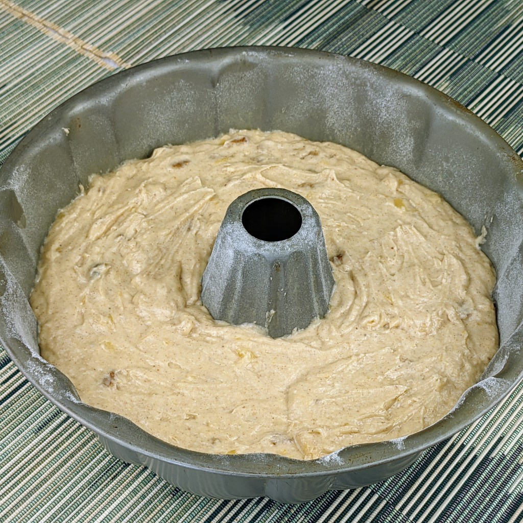 Preheat oven to 350 degrees Fahrenheit. Spray and lightly flour a Bundt pan, then set aside.