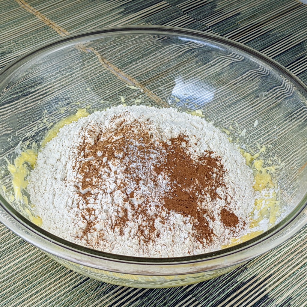 Place butter, sugar, eggs, salt, and vanilla in a large mixing bowl. Use a handheld mixture to mix all ingredients together. Stir in flour, baking powder, cinnamon, and nutmeg.