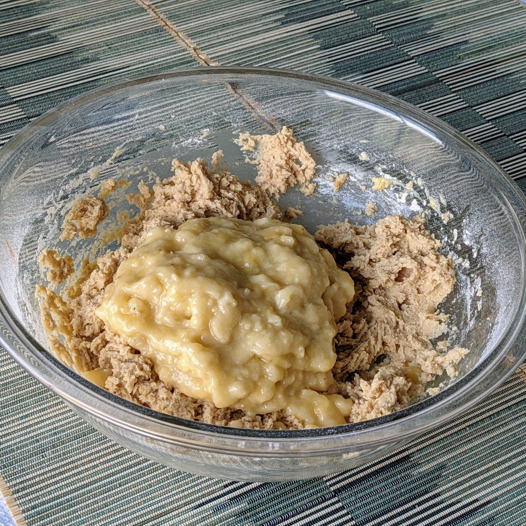 We like bananas at our house but the thing is they get soft and mushy too fast, and I’m often left with a lot of over-ripe bananas. I could freeze them but usually I don’t have enough freezer space. I recently had too many ripe bananas and also too much cream cheese in my refrigerator. I therefore thought — why not make banana bread with a cream cheese frosting?