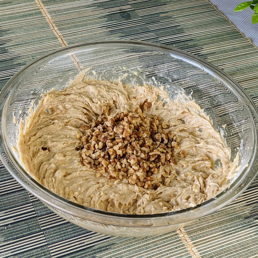 Add mashed banana to the creamed mixture, then mix well. Stir in chopped walnut.