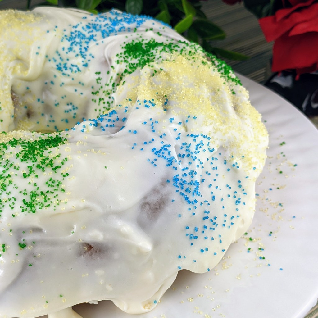 A great thing about making this is the wonderful aroma that fills the kitchen. You might be wondering why I have decorative sugar sprinkled over the frosting. This was to make it a bit festive for Mardi Gras. Alternatively you could decorate your bread with chopped walnuts, thinly sliced bananas, or melted chocolate. Of course you could also leave it plain, which would be a healthy option.