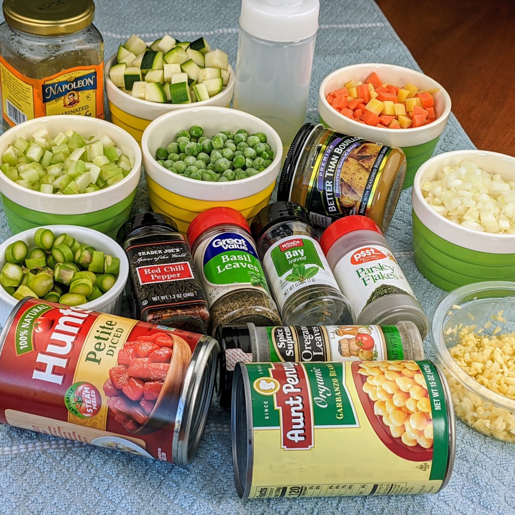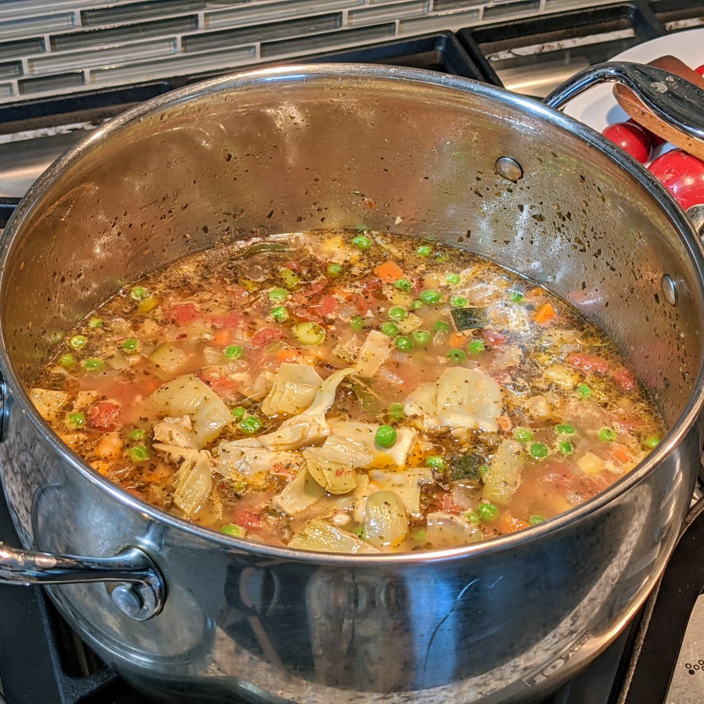 I am making my version with no meat and no pasta. It has lots of hearty veggies like onions, carrots, celery, artichoke hearts, asparagus, peas, and garbanzo beans. What gives my minestrone a unique flavor is marinated artichoke hearts, juice from the artichokes, asparagus, and garbanzo beans. This packs a lot of rich flavor!