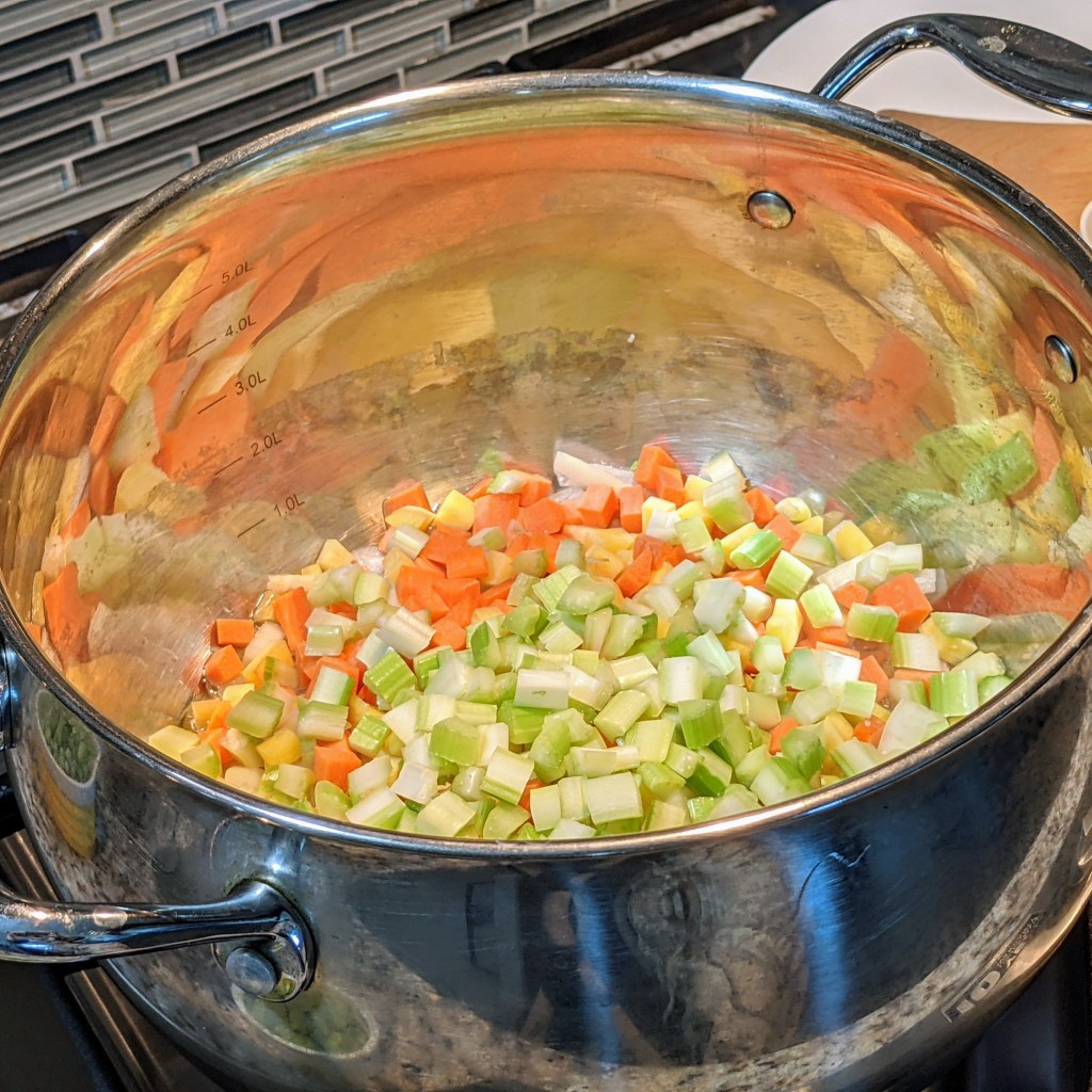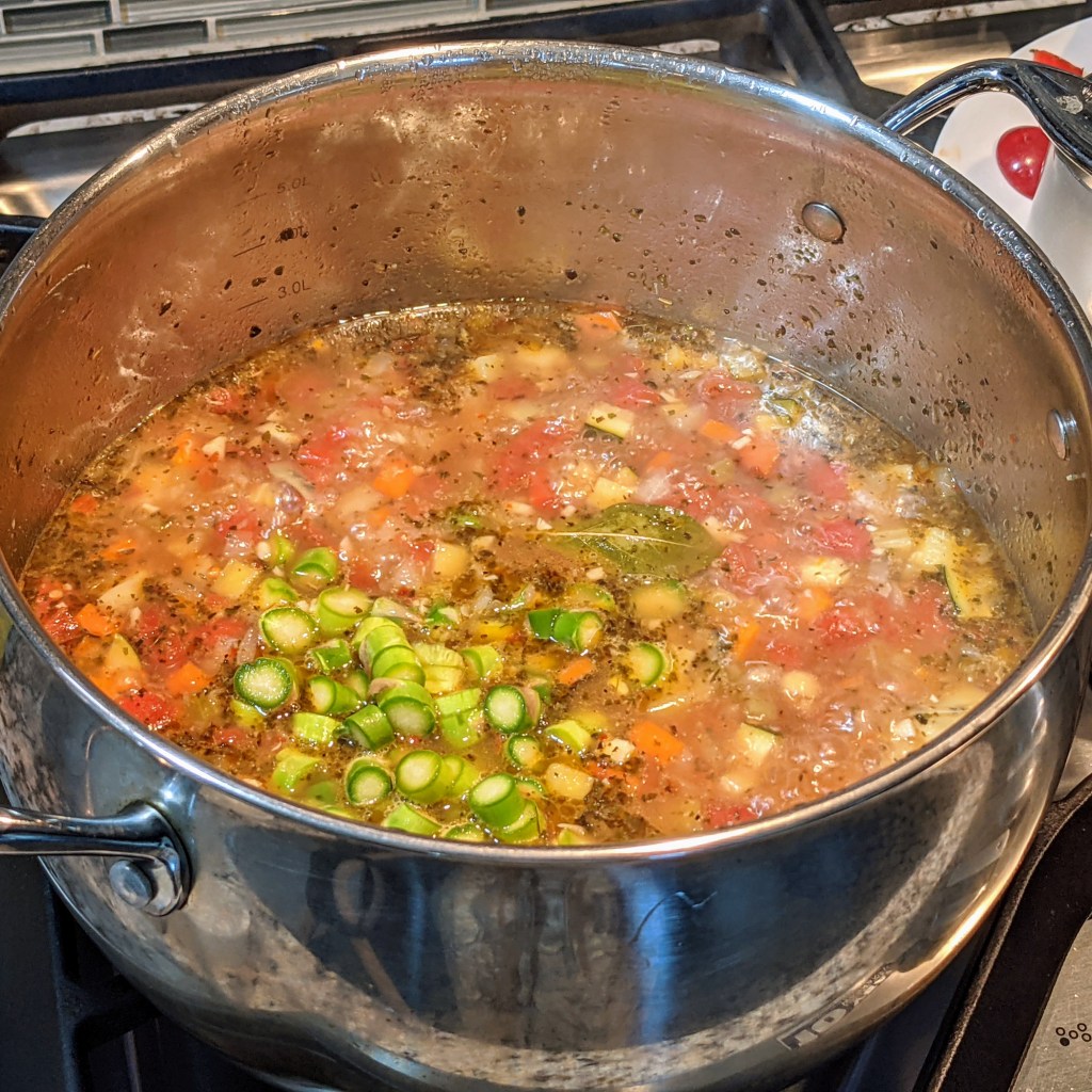 Today’s recipe is similar but even better in my opinion because I use fresh vegetables instead of canned. Minestrone is an Italian vegetable soup that can take a variety of forms but generally has pasta, beans, onions, celery, tomatoes and a broth of some nature. It may have meat or no meat.
