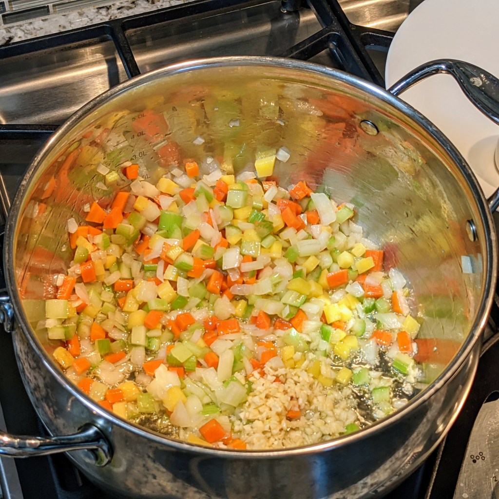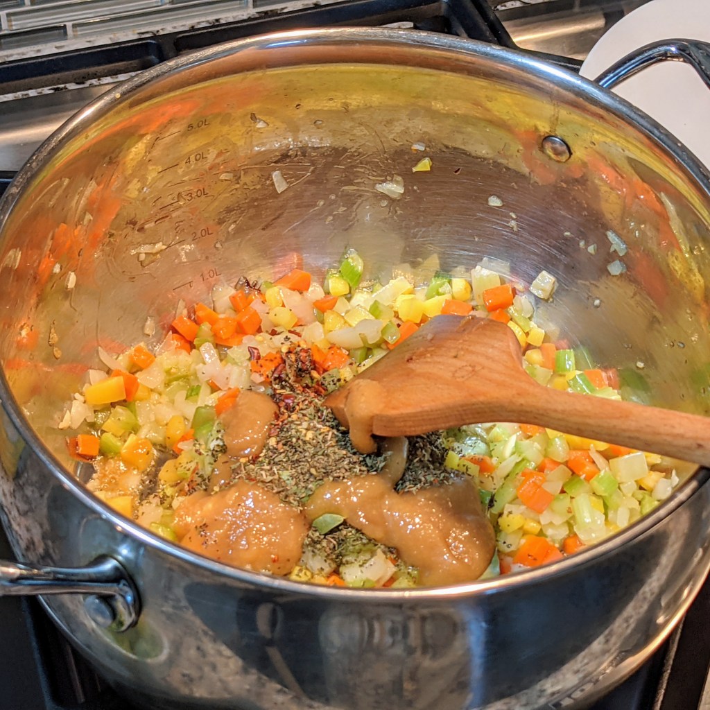 Heat oil in a large soup pot over medium-high heat. Add onion, carrots, and celery. Cook for 5 minutes, stirring in between. Add garlic and cook for another minute. Turn down the heat to medium-low, then add all the spices including salt and garlic base. Stir all the ingredients well, cooking for another minute.