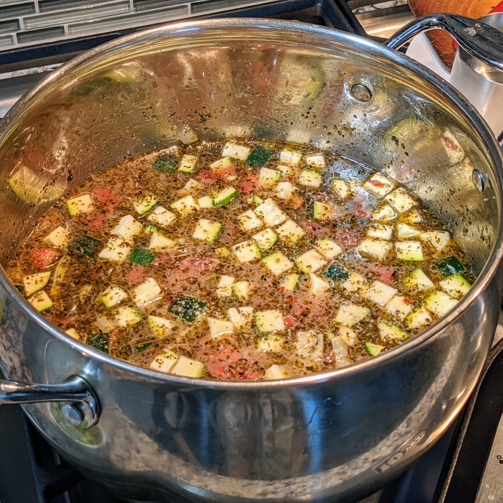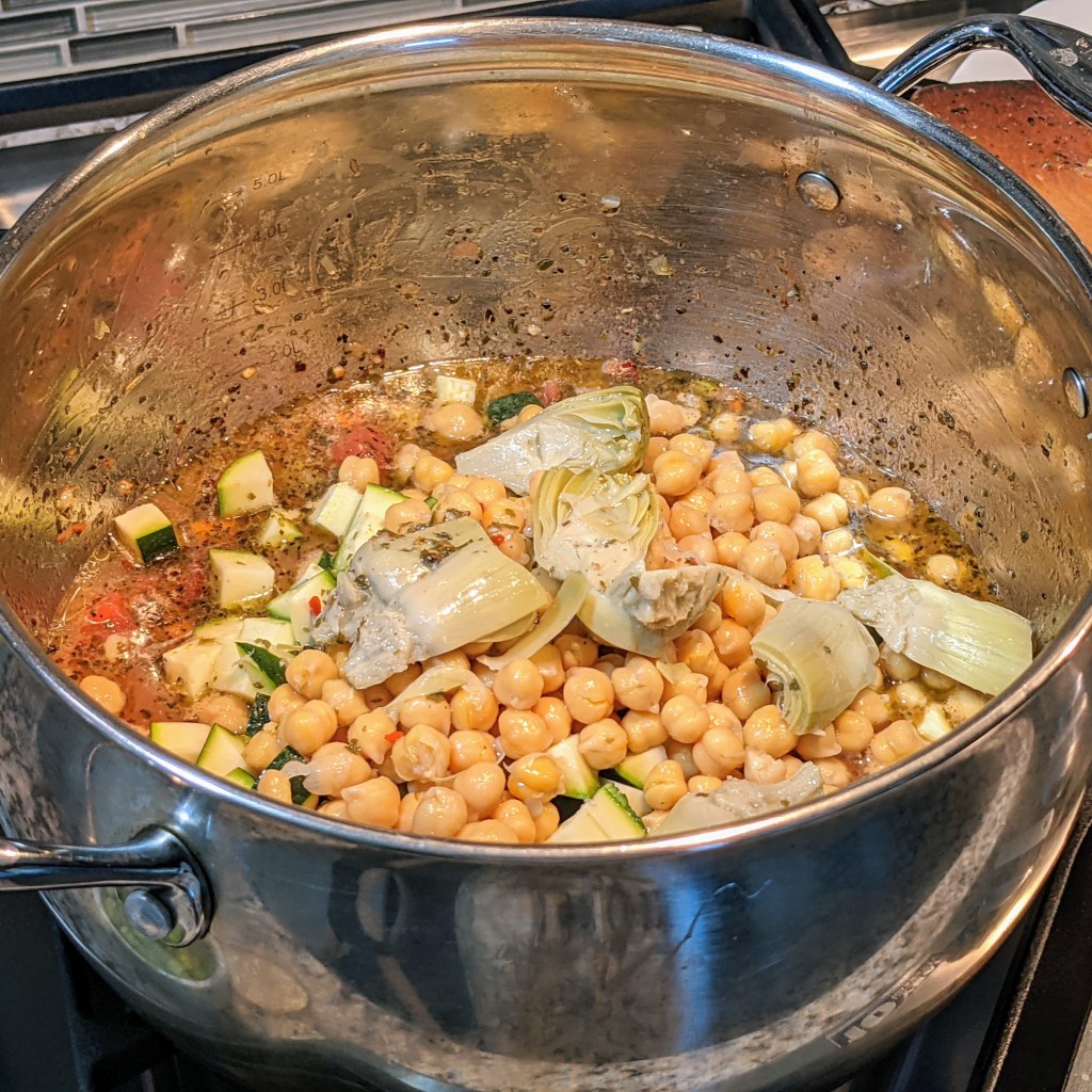Add zucchini, garbanzo beans, artichoke, liquids from the artichoke, and water. Stir well, turn up the heat to medium-high, bring to a boil, then cover and cook for 7 minutes.