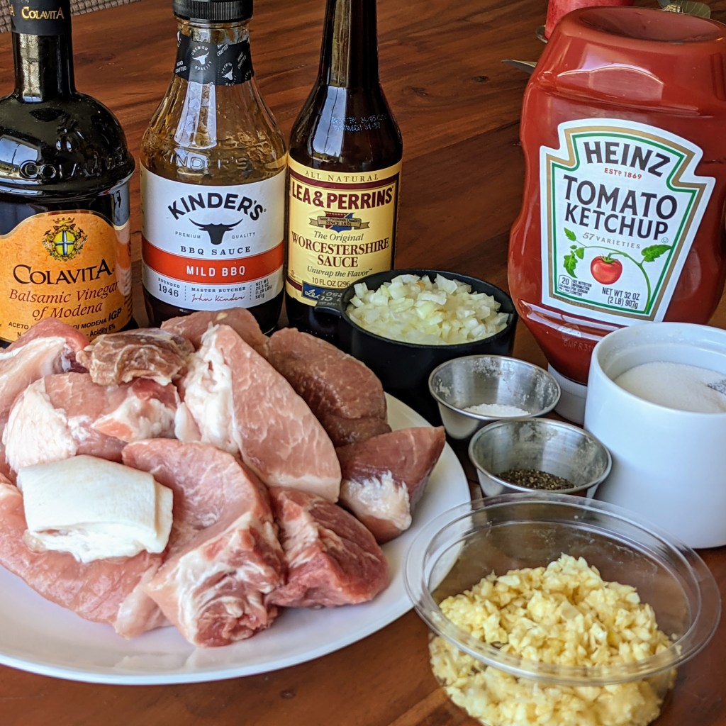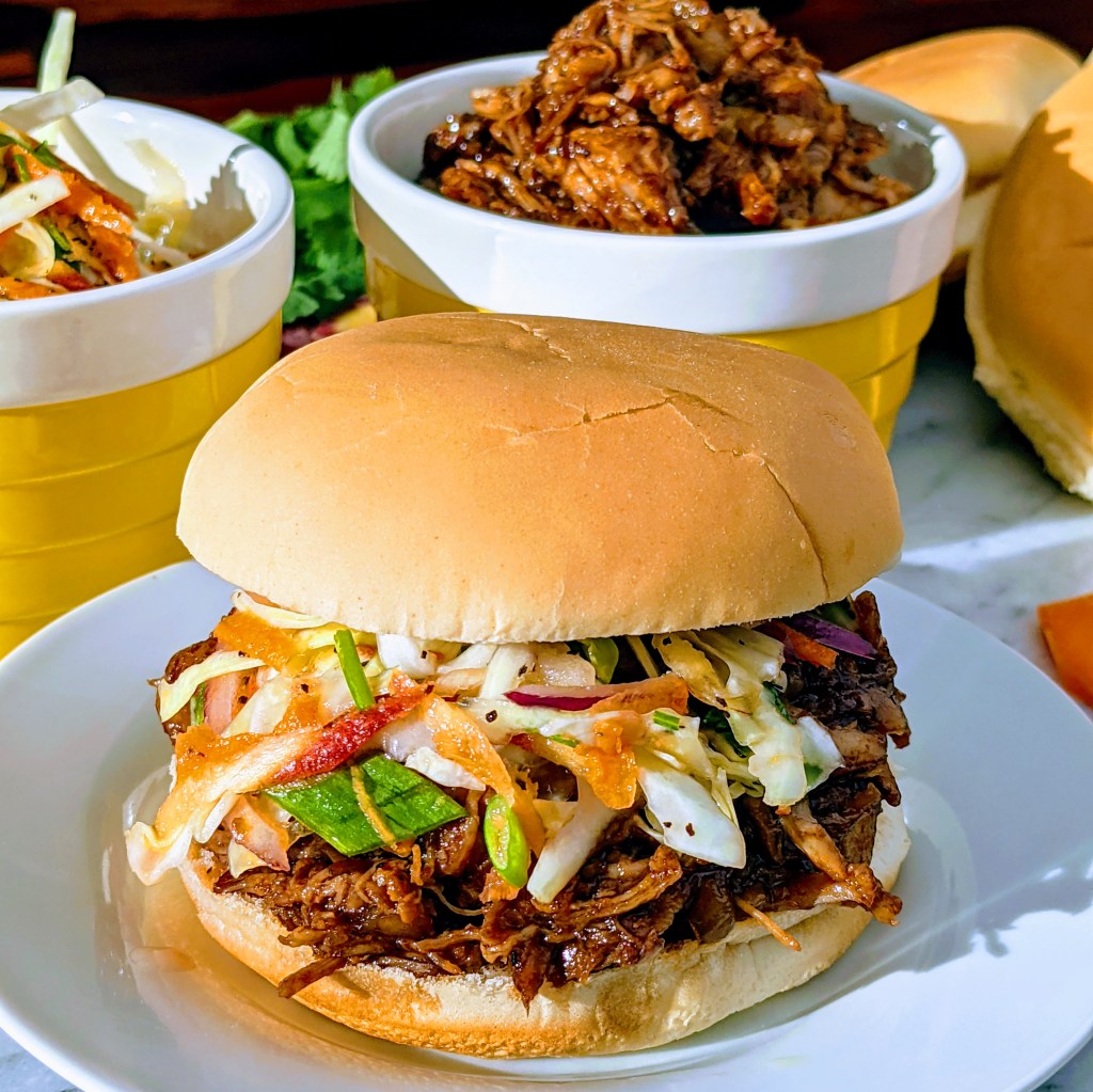 I use pork butt as it creates the most flavorful, tender, and juicy result. I add ingredients like balsamic vinegar, sugar, Worcestershire sauce, and ketchup among other things. These ingredients create a sweet and slightly tangy sauce. You can serve this sandwich between buns with a vinegar-based slaw. You can also served it with sides like potato salad, easy baked beans, and corn bread. This could also work as a topping for pizza.