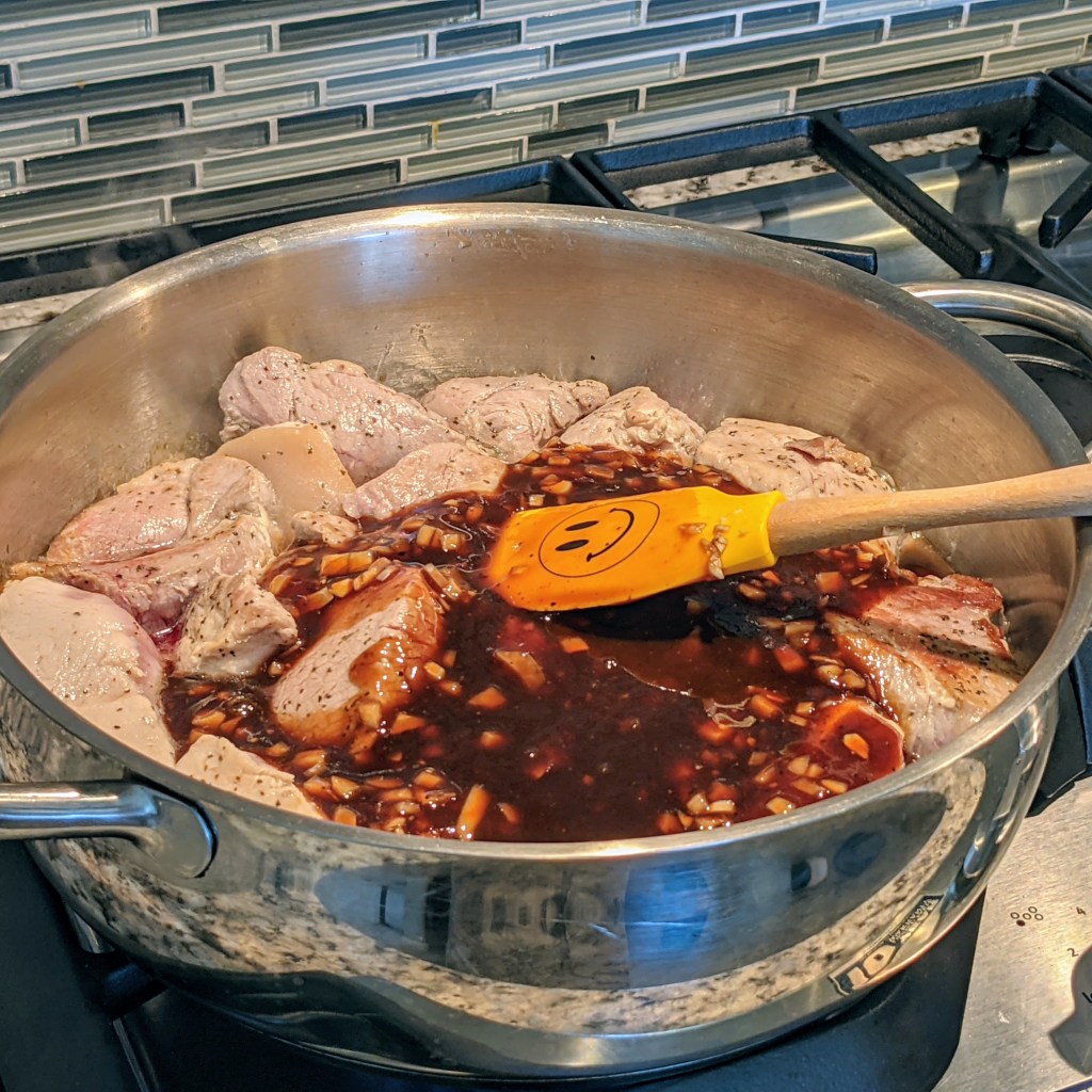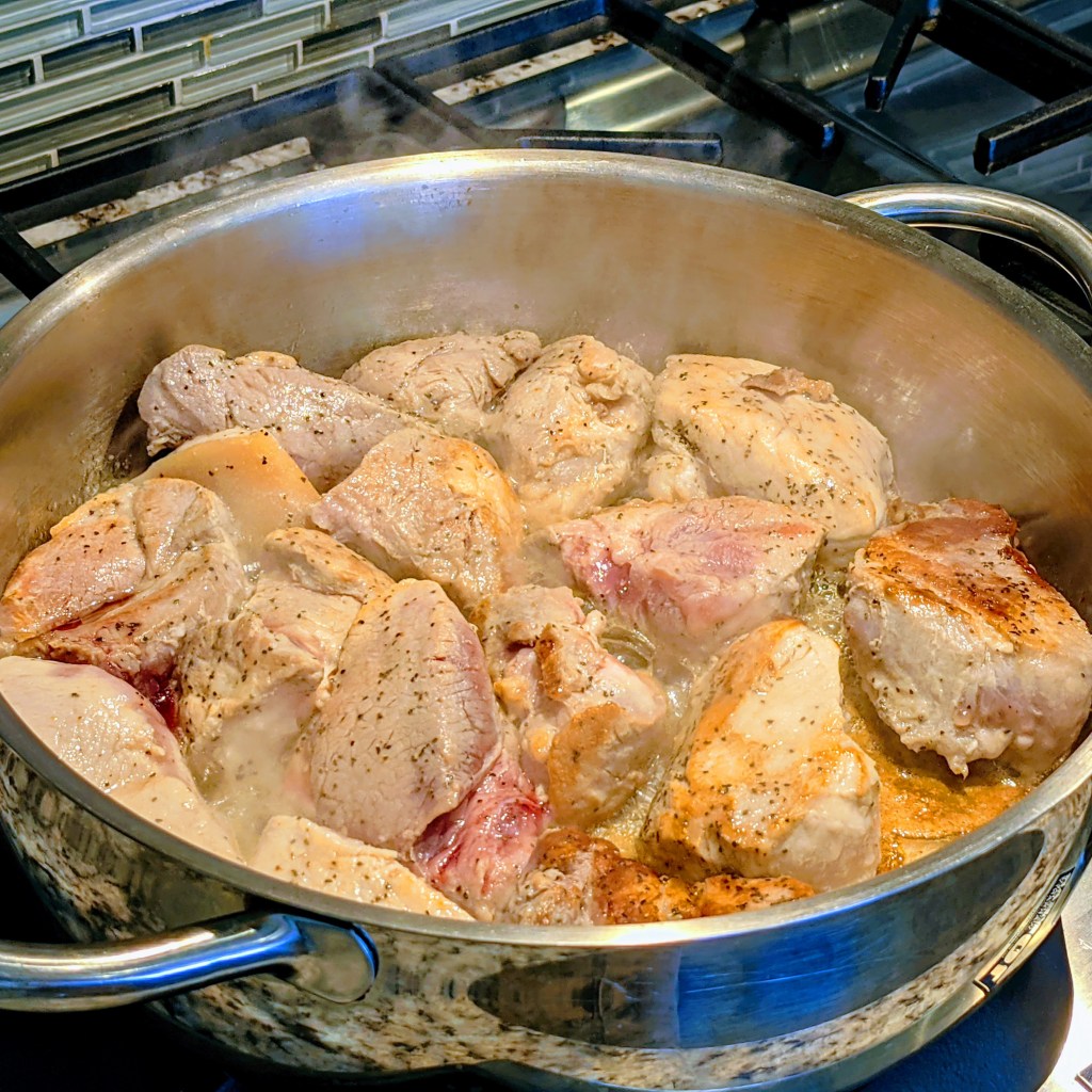 - 3 lbs. pork butt, cut into 1-inch wide, 2 1/2-inch long pieces