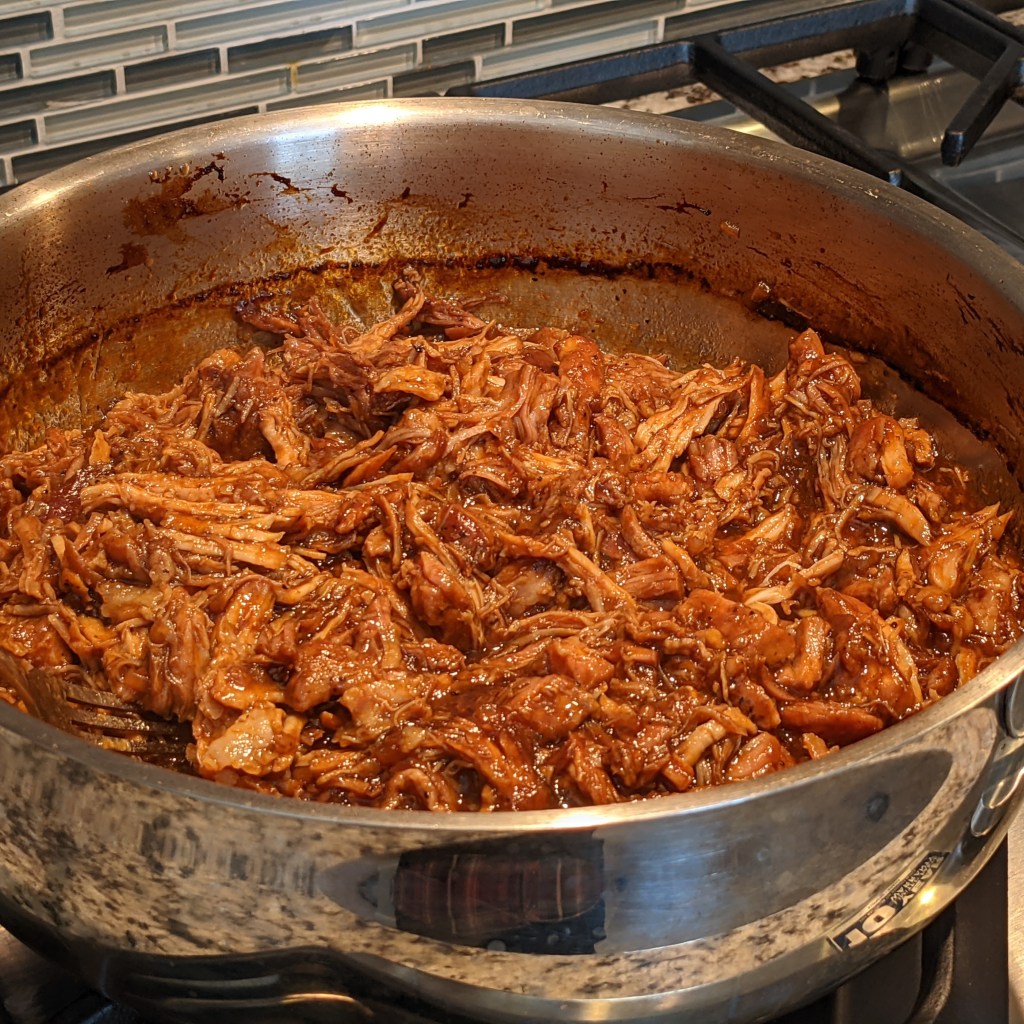 Cover and transfer the pan to preheated oven. Cook for 2 to 2 1/2 hours or until pork is fork tender. (Able to be shredded with a fork.) When cool enough to handle, shred the pork with couple of forks, then mix well with the pan sauce.