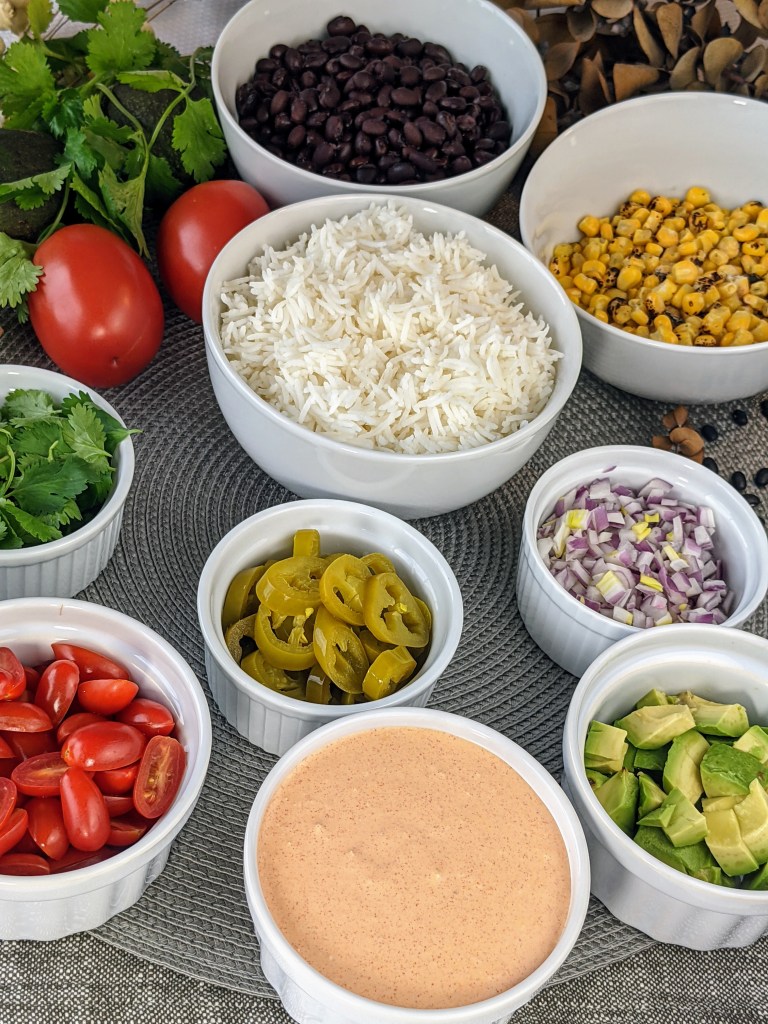 I created a wonderful chipotle sauce for a bagel sandwich a few months back. The sauce had such a unique flavor that I thought I should use this for some other application. Rice bowls are really popular with my family and I thought the chipotle sauce will go perfectly with a rice bowl. I love creating bowls with rice, noodles, or other grains. There are so many possibilities. Rice bowls are really nice since you can customize your toppings, proteins, garnishes, sauces, and cheese.